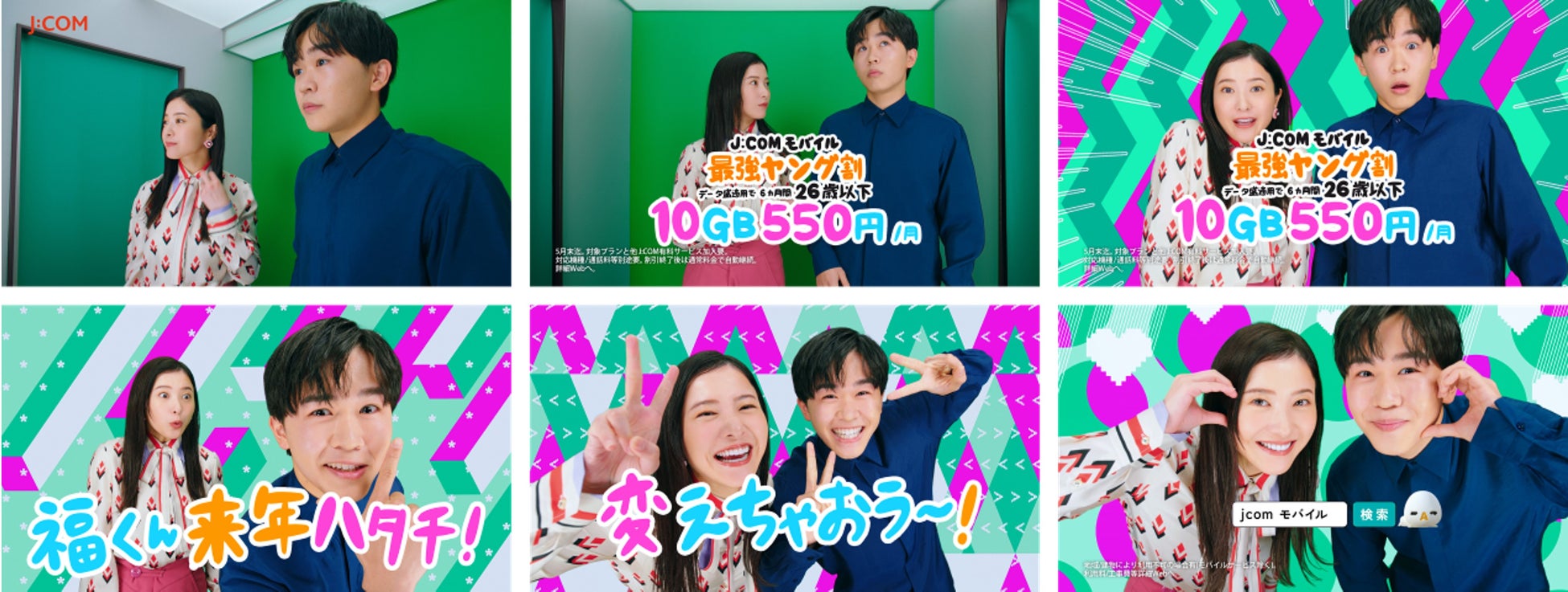 写真を一緒に撮ろうとする吉高さんと鈴木さん。すると、突然、「J:COMの最強ヤング割は26歳以下のスマホ代が10GB 550円!! 家族も550円!!」とアナウンスが流れます。それを聞いた吉高さんと鈴木さんは「え??」っと想定外の出来事と、キャンペーンのお得さに驚きと喜びの表情。そして「来年、福君はハタチ~」というアナウンスに、鈴木さんは決めポーズ。吉高さんは「そうなの~!?」と驚きを隠せない様子。そして「スマホはJ:COMに」というアナウンスに合わせピースを決めながら、「変えちゃおう〜!!」と声を揃えます。最後は、カメラ目線でルダハート(ほっぺハート)の決めポーズをして、「J:COMで決まり!」と締めくくります。