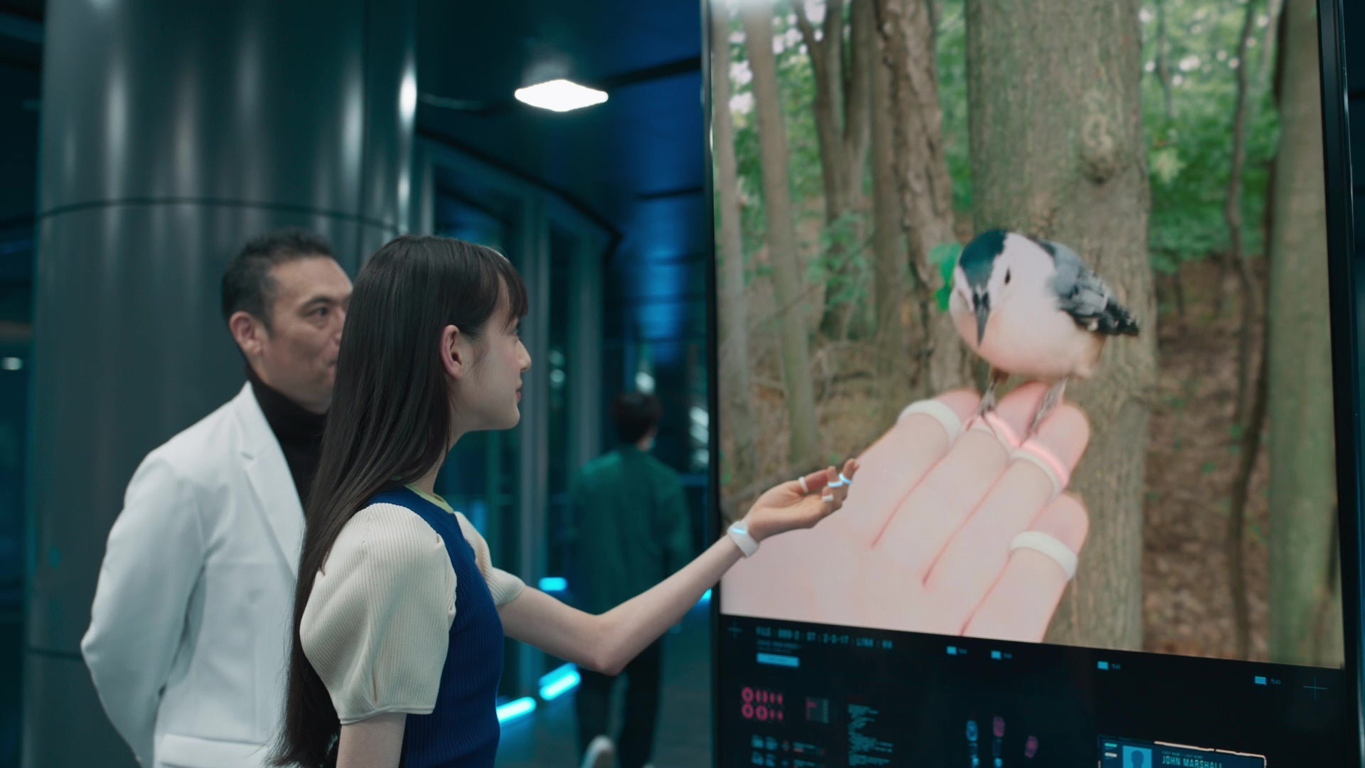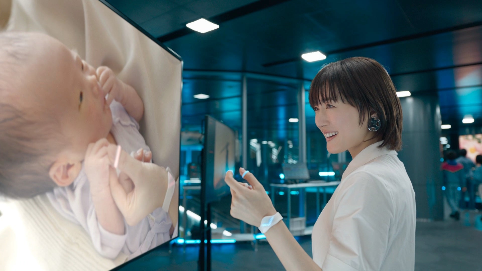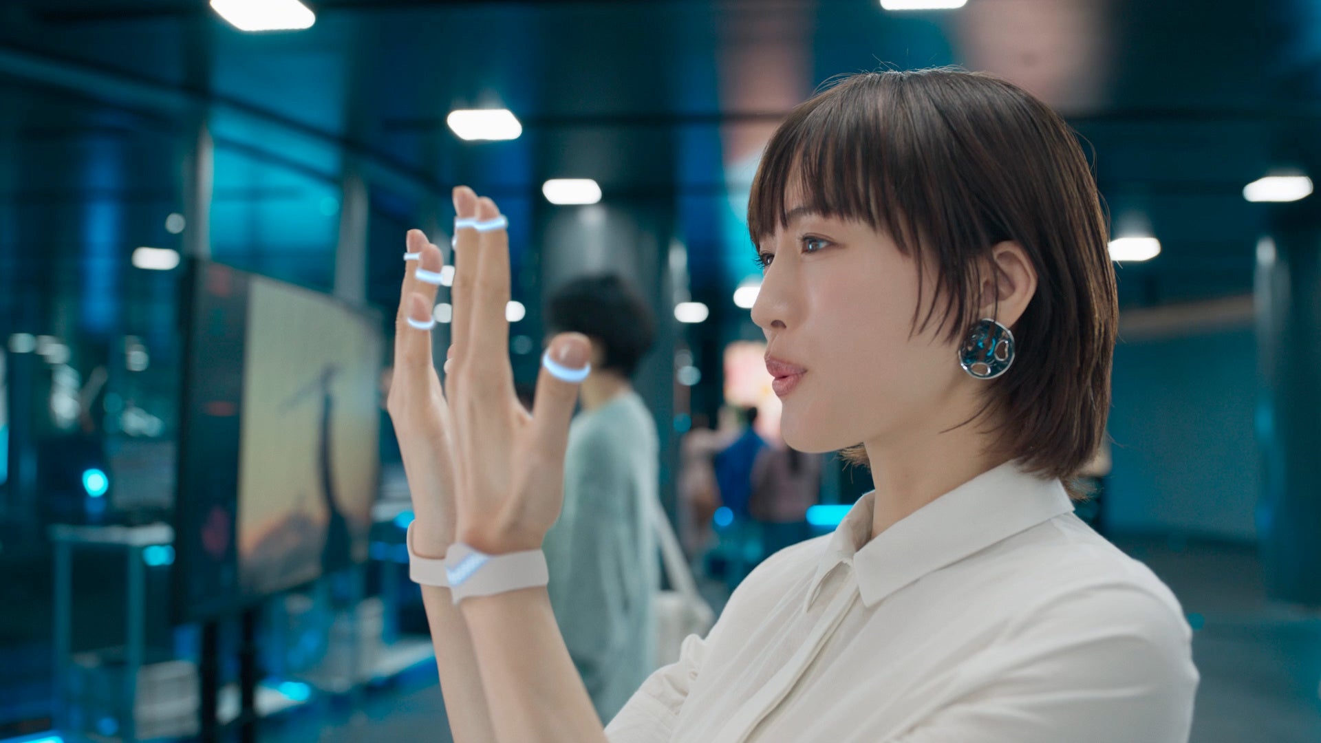 手にデバイスをつけた綾瀬さん。アニマルカフェで”ふわふわ”のフェネックを抱きかかえた綾瀬さんからは自然と笑みがこぼれます。場所は一転して広大な砂漠。しゃがみ込んだ綾瀬さんが砂を手に取ると、デバイスをつけた手の上を”サラサラ”と砂が流れていきます。さらに場所は変わって、綾瀬さんは友達夫婦の家に。赤ちゃんの手を握った綾瀬さんは、あまりの柔らかさに、思わず「ぷにぷに!」と幸せに満ちた声を上げます。