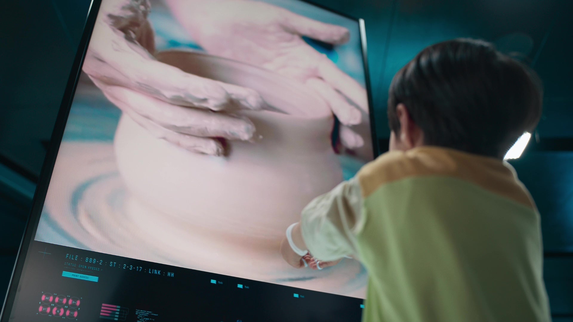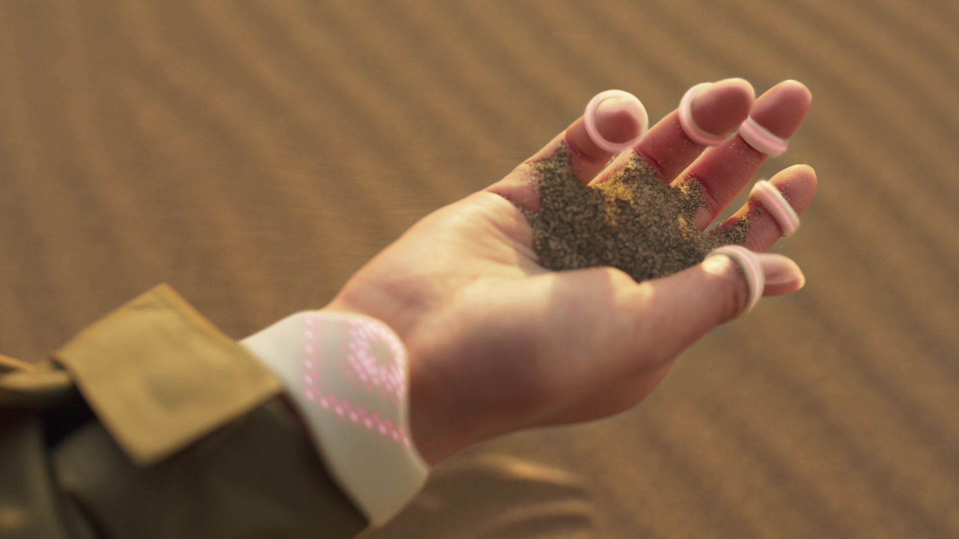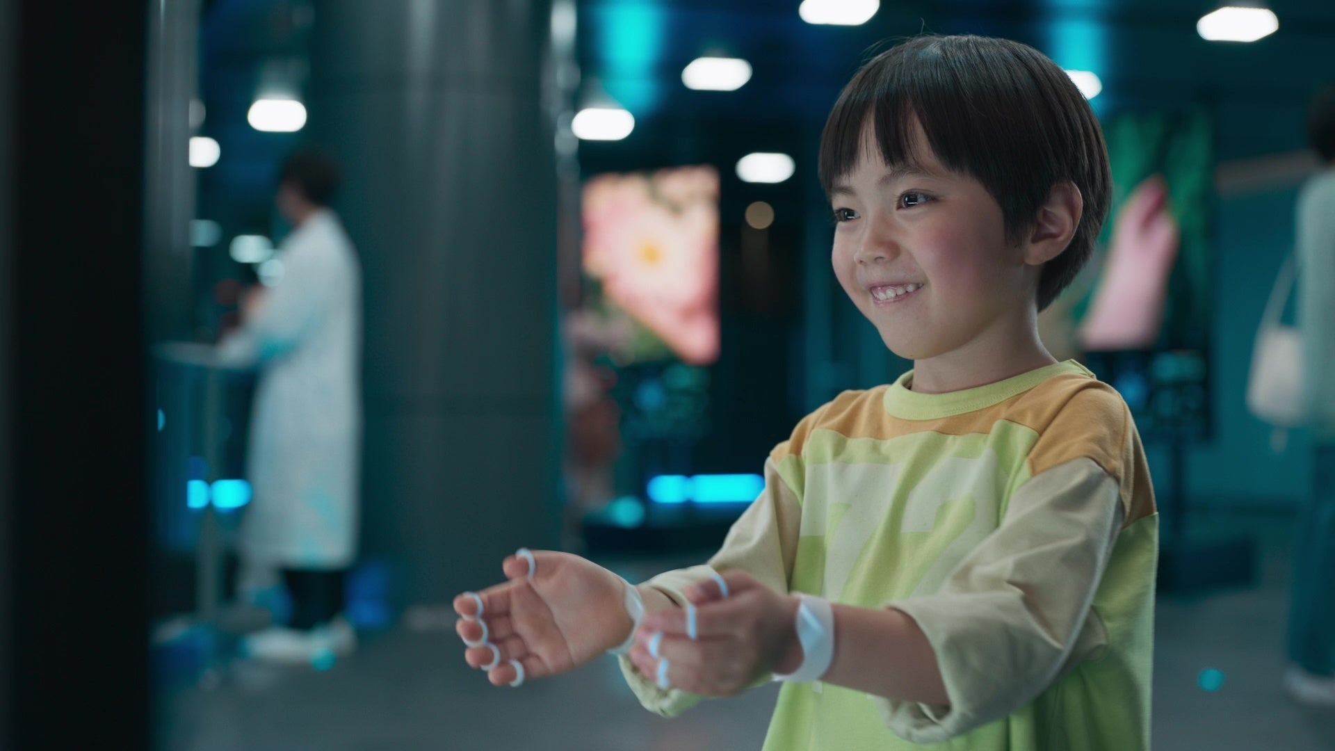 手にデバイスをつけた綾瀬さん。アニマルカフェで”ふわふわ”のフェネックを抱きかかえた綾瀬さんからは自然と笑みがこぼれます。場所は一転して広大な砂漠。しゃがみ込んだ綾瀬さんが砂を手に取ると、デバイスをつけた手の上を”サラサラ”と砂が流れていきます。さらに場所は変わって、綾瀬さんは友達夫婦の家に。赤ちゃんの手を握った綾瀬さんは、あまりの柔らかさに、思わず「ぷにぷに!」と幸せに満ちた声を上げます。