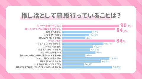 他にも、「SNSで推しの魅力を語る(75%)」「推しを他人に布教する(約62%)」という回答も多く、皆さんの「推し活」のおかげで、推しの魅力がさらに広まっているんだと思いました♪