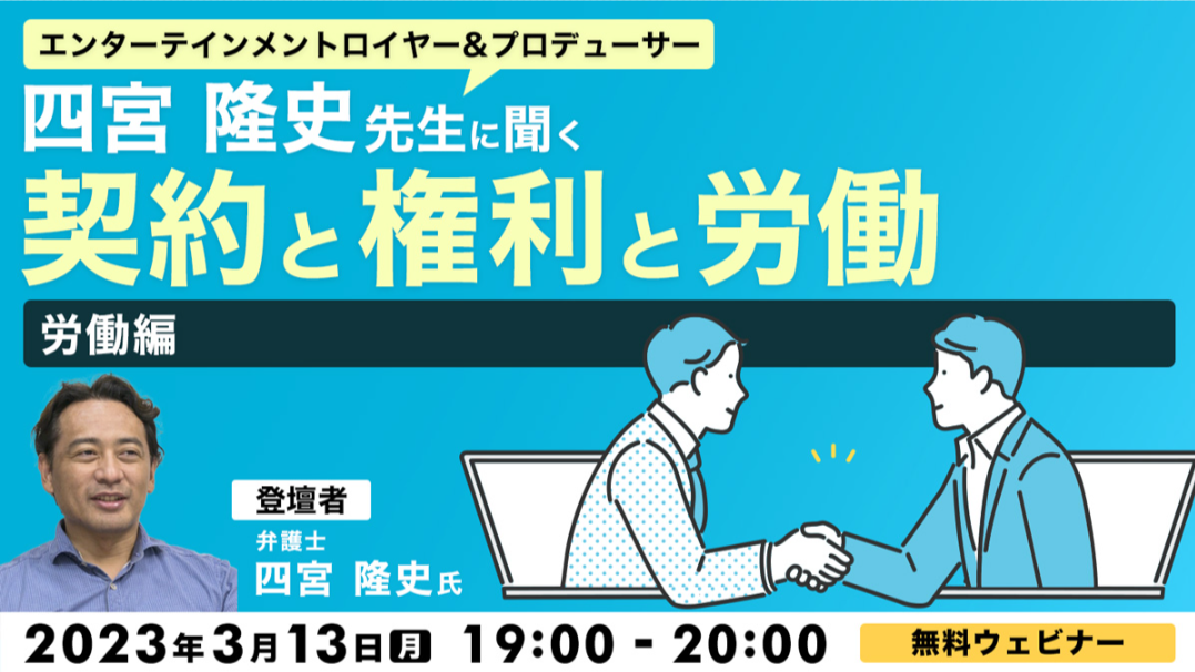 【映像クリエイター向け】TV・YouTubeなど、エンタメにまつわる法律を学ぶ 3/13(月)無料セミナー「四宮隆史先生に聞く 契約と権利と労働 ~労働編~」