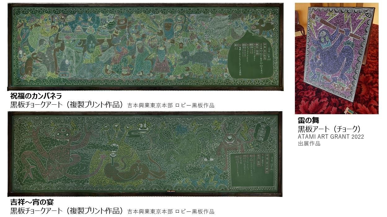 このほかアクリルキャンパス画や黒板チョークアートも展示します。さらに、ほぼ毎日、本人が在廊し、黒板チョークアートやかまぼこ板を公開制作していく予定です。会期中には、先輩芸人でアートの世界でも才能を開花させているとろサーモン・久保田が会場に駆けつけ、ピストジャムとその個展を応援する予定です。