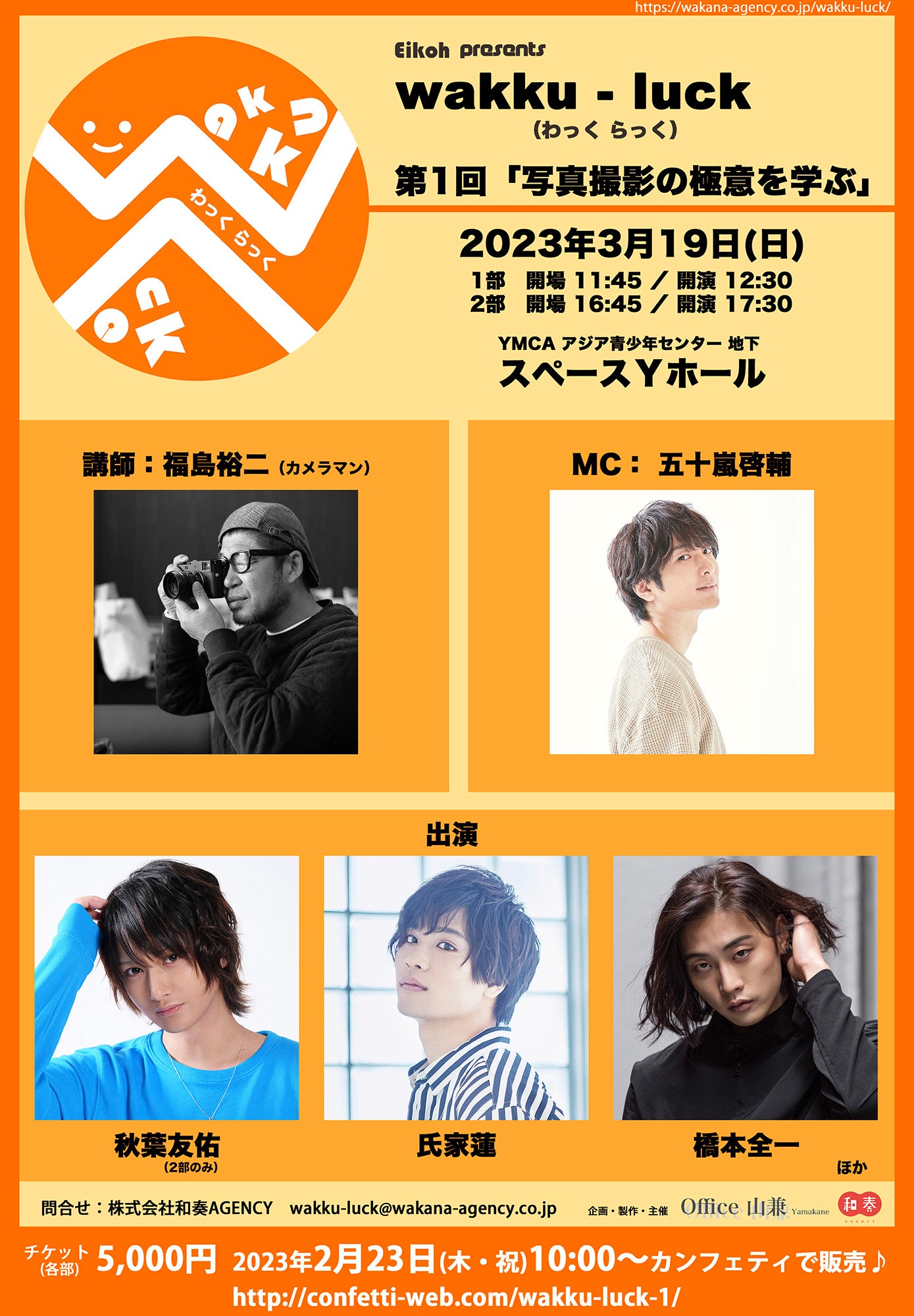 株式会社永晃 協賛、Office山兼 企画・製作・主催、wakku-luck 第1回『写真撮影の極意を学ぶ』が2023年3月19日 (日)にYMCA アジア青少年センター 地下 スペースYホール(東京都千代田区猿楽町2-5-5)にて開催されます。