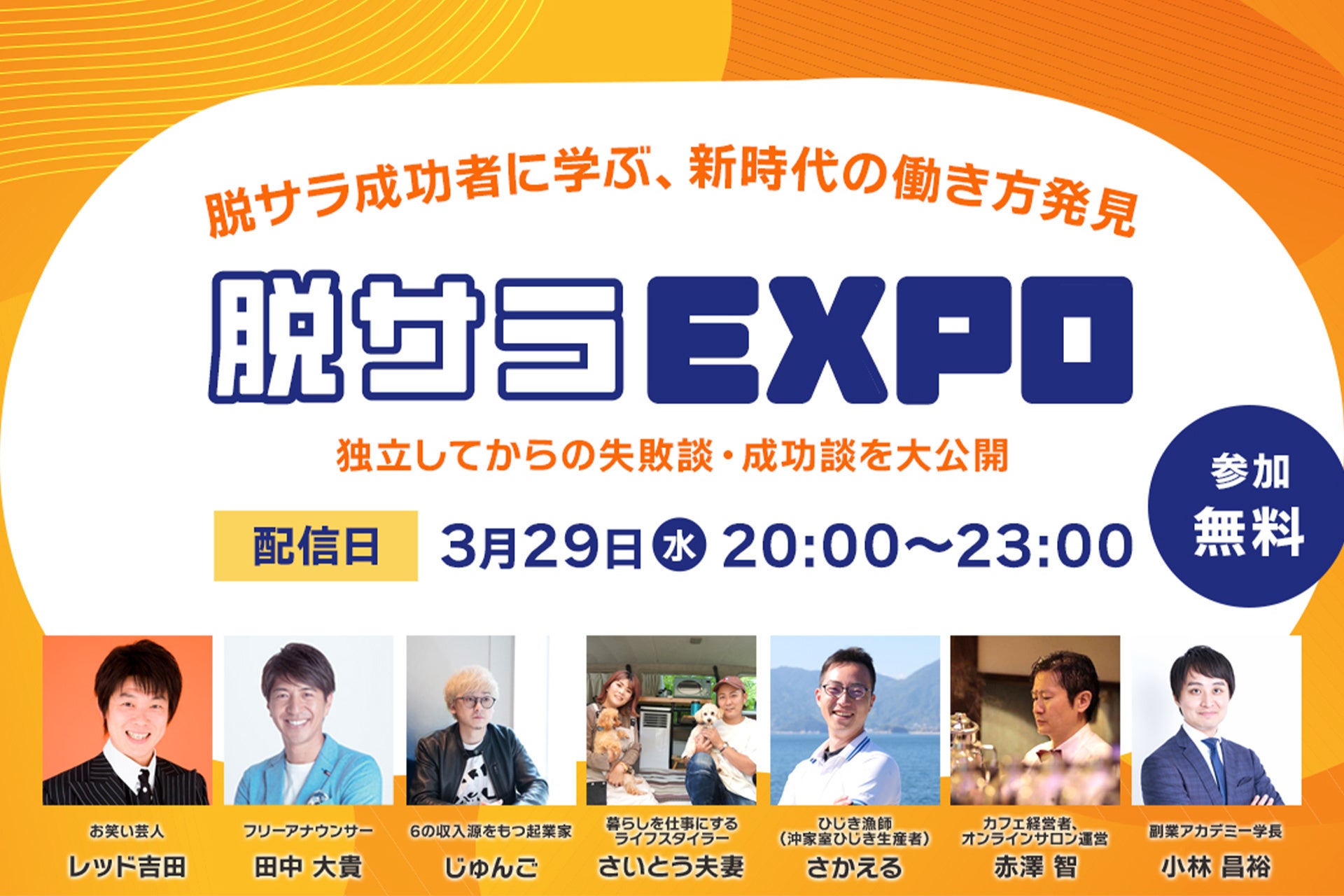 2023年3月29日(水)に「脱サラEXPO」を開催します。7名のお笑い芸人・漁師・カフェ経営者・YouTuber・起業家など様々な成功者たちが登壇し、会社員時代から脱サラ、起業するまでの経験談や失敗談を語っていただきます。会社員時代はどのような準備をしたのか、また0からスタートして継続的に稼いでいく方法など、成功者たちの成功ルールを学び、脱サラがなかなか踏み出せない方へ勇気をお届けします。