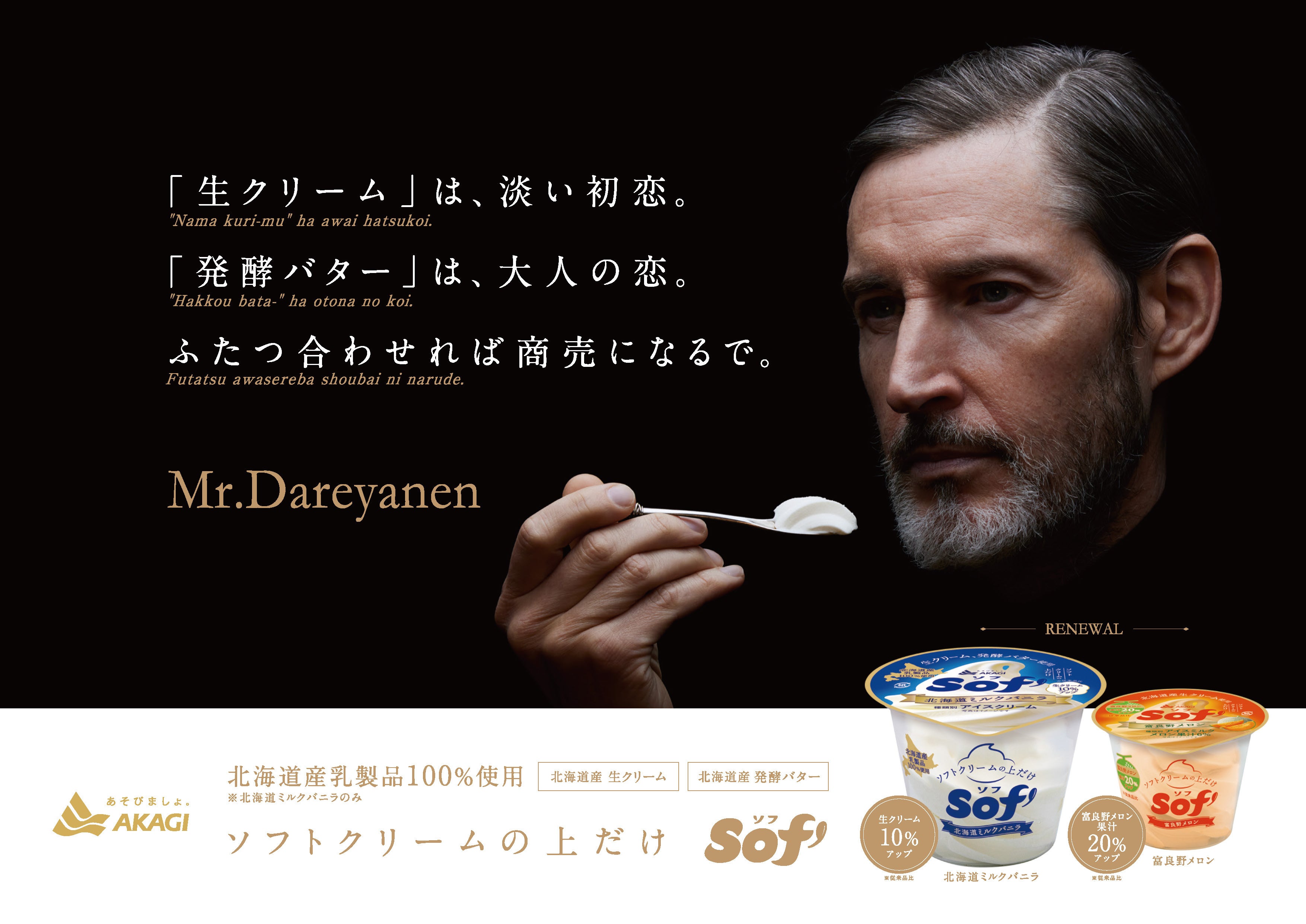 新商品の発売に伴い、TV-CMを2023年2月27日(月)からオンエアいたします。「Sof’(ソフ)」の素材の良さ、本格感を訴求するために、偉人風のMr. Dareyanen(ミスターダレヤネン)が、格言のように商品の特徴を伝える、上質な世界観のCMに仕上がっています。北海道ミルクバニラの商品特徴である「発酵バター」と「生クリーム」を恋に喩えながら物思いにふけるDareyanen氏を描く「偉人篇」。そして、Dareyanen氏のメッセージを受け取った、物憂げな眼差しの女性を描く「映画篇」。アイスの特徴を伝えているのに、アイスのCMらしくない、斬新な世界観をお楽しみください。