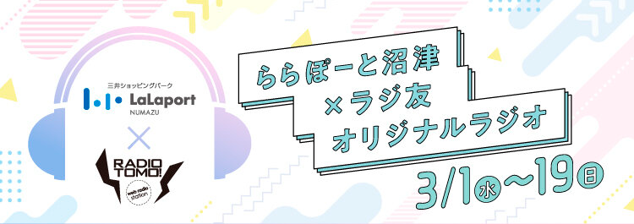 ぽーと沼津は、2023年3月1日(水)~3月19日(日)の期間、 Webラジオステーション「ラジ友」とタッグを組み、「ららぽーと沼津 × ラジ友 オリジナルラジオ配信 & オリジナルボイスラリー」を開催いたします。