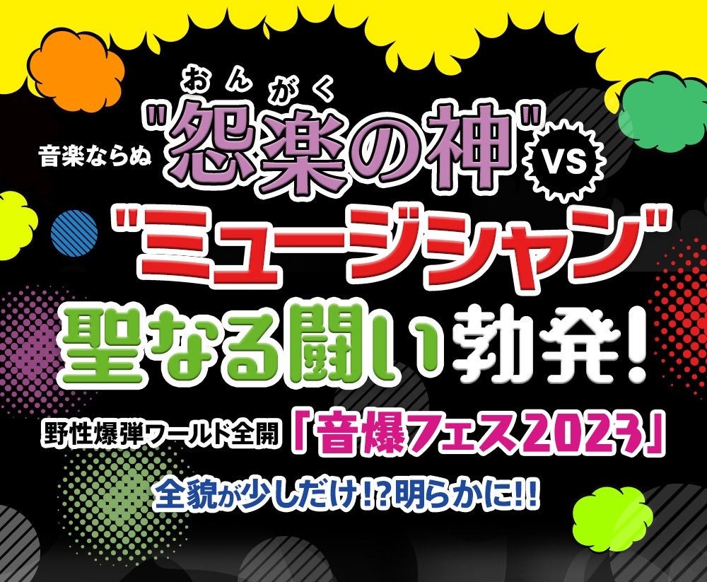 音爆フェスは、まさに「野性爆弾ワールド」全開。神聖な音楽の神に成敗された、くっきー!=(音楽ならぬ)“怨楽の神”が、その恨みを晴らすべく、フェス初日の3月4日(土)に大阪城音楽堂に降臨。「音楽の力で世界を救おうとする民、その全てを滅ぼすのだ!」と、アーティストのステージ終わりに、邪悪な家来を引き連れたくっきー!が突然姿を現し、次々と恐怖の攻撃!?を仕掛ける。登場する吉本タレントたちも、くっきー!に操られ、邪悪な旋律を奏でる。一方、心清きミュージシャン達も必死の抵抗で、反撃を仕掛ける…ただの音楽フェス、では終わらない。2日間に渡り、音楽の存亡を懸けた聖なる闘いが、今、ここに勃発するのだ!そして、この「音爆フェス」は、未知の、一つの物語へと昇華する—果たしてミュージシャンたちは、怨楽の神に打ち勝ち、「真の音楽のチカラ」で世界を平和にすることができるのか!?