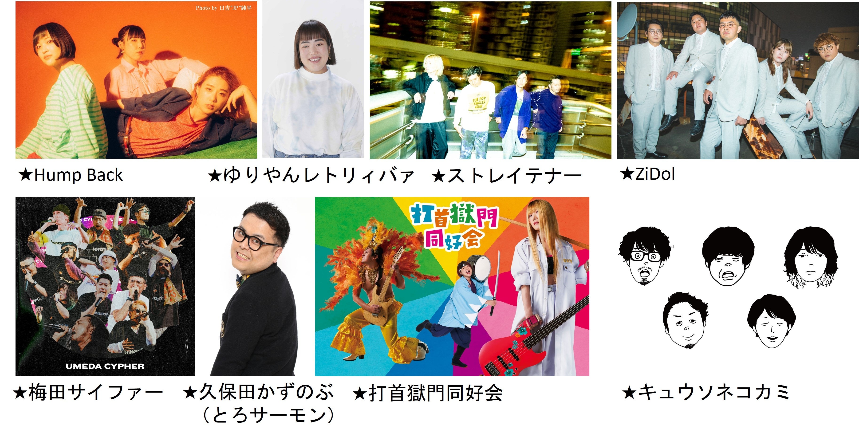 ★Hump Back ★ZiDol ★ストレイテナー ★梅田サイファー ★久保田かずのぶ(とろサーモン) ★打首獄門同好会 ★ゆりやんレトリィバァ ★キュウソネコカミ