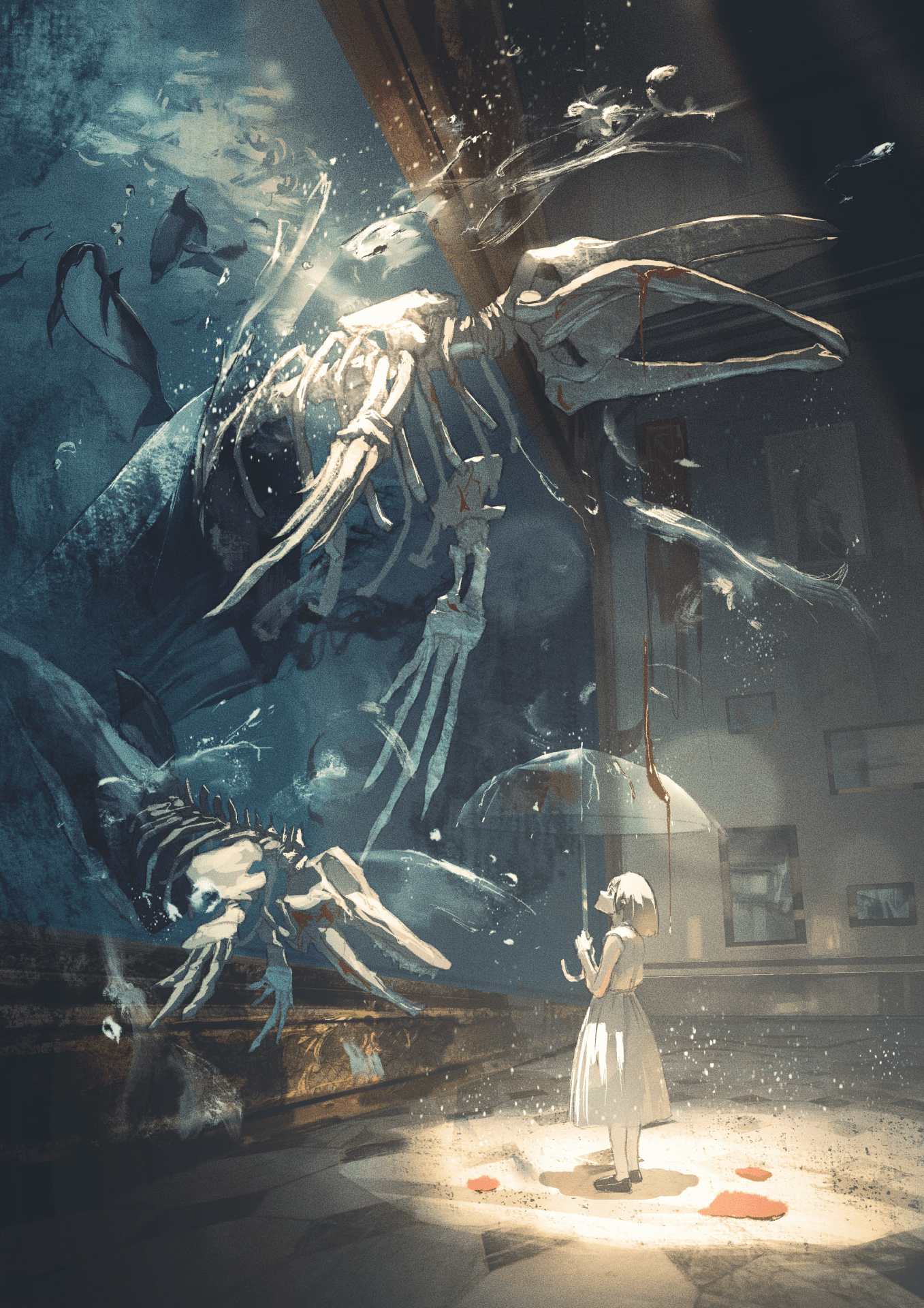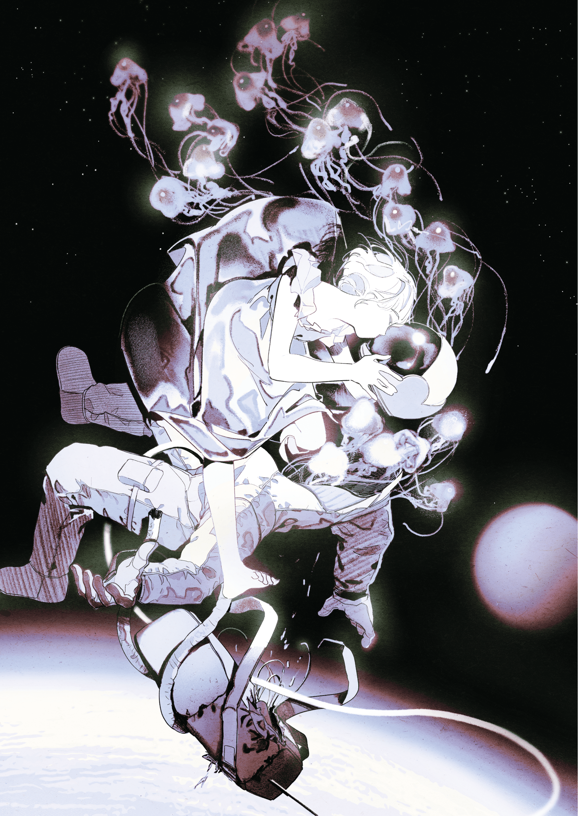 「躍動感のある構図、題材へのアプローチ、前後を想像させるドラマチックなストーリー性。どれを取っても完成度の高い作品。ここに描かれているのは、生か死か。消え入るように白い少女は何者なのか。クラゲの意味するものとは?宇宙の神秘的な世界と相まって、じっくり想像しながら眺めていたい逸品。」