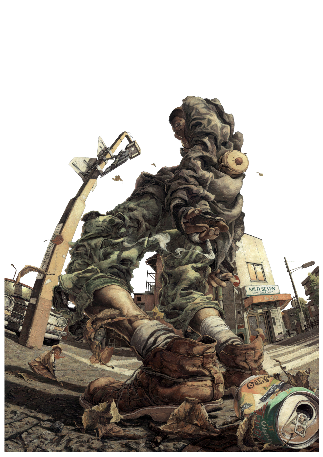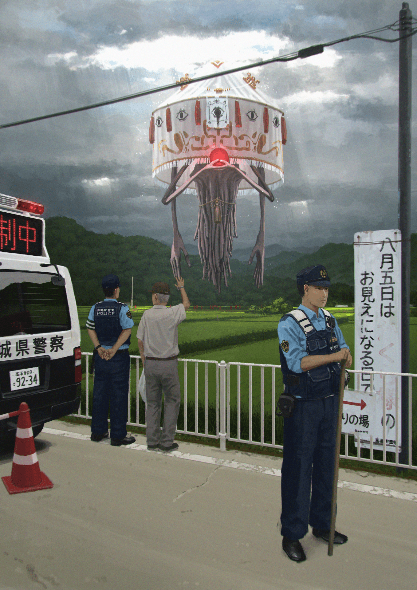 「確かな描写力とテーマ性を兼ね備えた作品。警察やカラーコーンの位置など、細部へのこだわりがしっかりと現実感を喚起する一方で、明らかにヤバいものが宙に浮いている違和感が楽しい。看板の演出も憎い。技術に加えて、絵一枚でここまできちんとストーリーを築き上げられる18歳はそう多くないのではないだろうか」