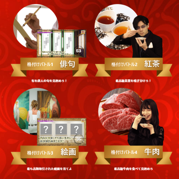 格付けバトルは、有名テレビ番組でおなじみの、見たり嗅いだり食べて「一流の品」を見極めるクイズゲームが楽しめる体験型の企画です。オンライン、リアル、ハイブリッドどの形式でも開催可能です。