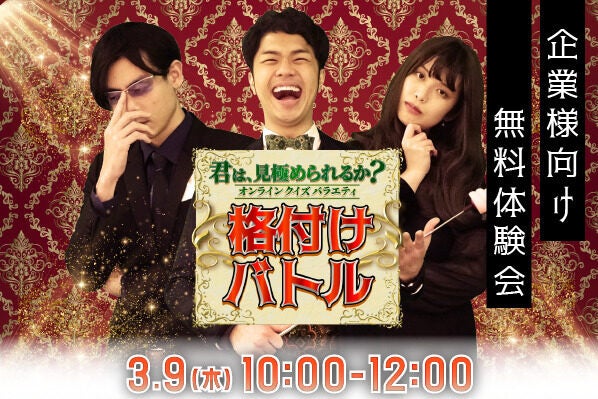 企業向けイベントや研修の企画運営を年間1,000件以上行う株式会社IKUSA(本社:東京都豊島区、代表取締役:赤坂大樹)は、2023年3月9日(木)に「食べて見て嗅いで!五感を活用した新しいパーティーゲーム『格付けバトル』」の企業向け無料体験会を開催いたします。オンライン上で実施するため、自宅やサテライト会場などの他拠点間でも体験可能です。