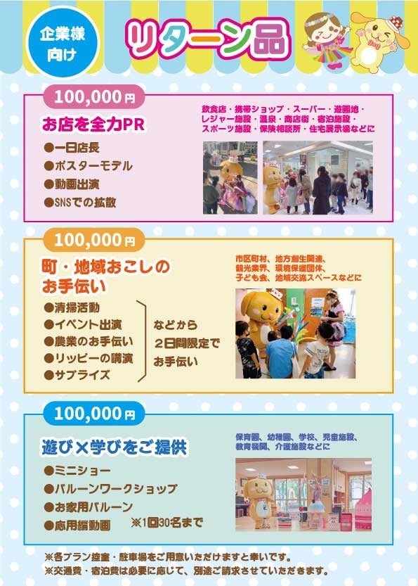ご支援いただいた企業様(お店や町・地域、教育施設)などにおけるお手伝いサービスをご提供。