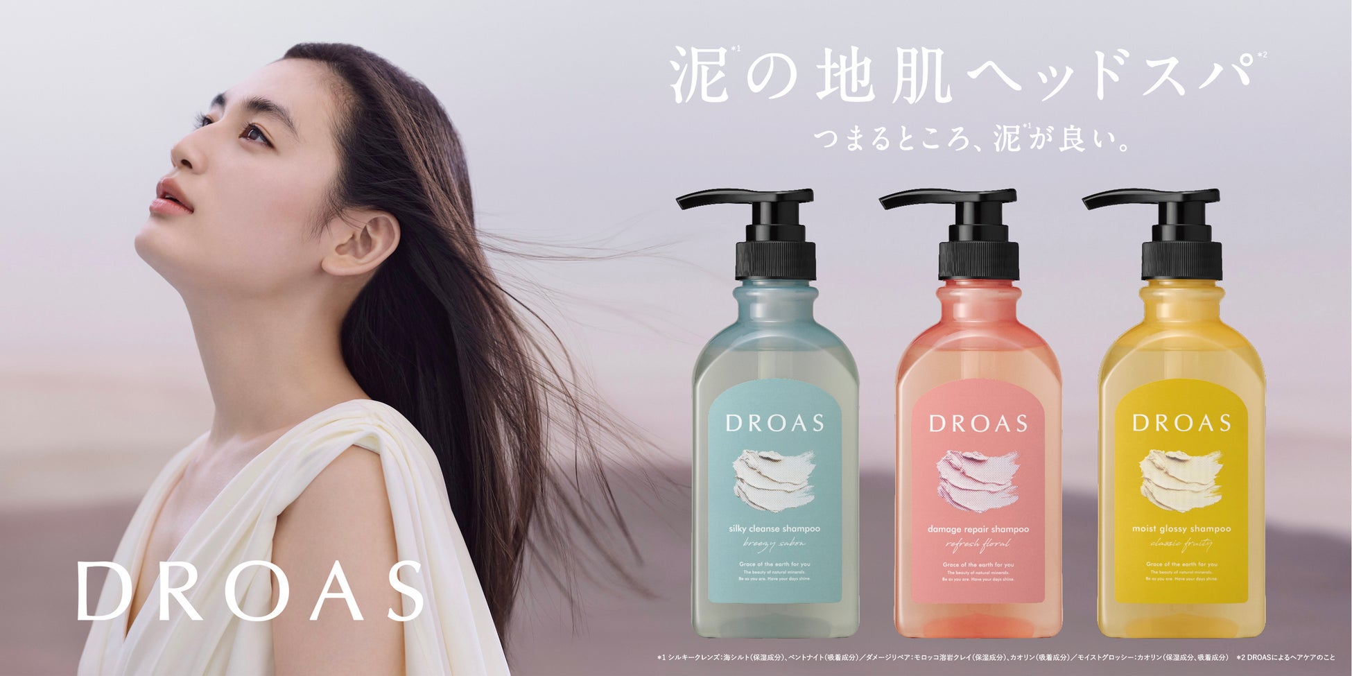 デビュー以来、映画やドラマ、広告など様々なシーンで女優として活躍されている八木莉可子さん。そんな彼女が持つ美しさや芯の強さ、そして併せ持つ透明感が、新しいDROASのブランドイメージと親和性を感じ、公式アンバサダーとして起用しました。泥美容によって髪や地肌、素肌も、本来の美しさへ生まれ変わる「トータルクレイビューティ」をドラマティックに演出してくれました。