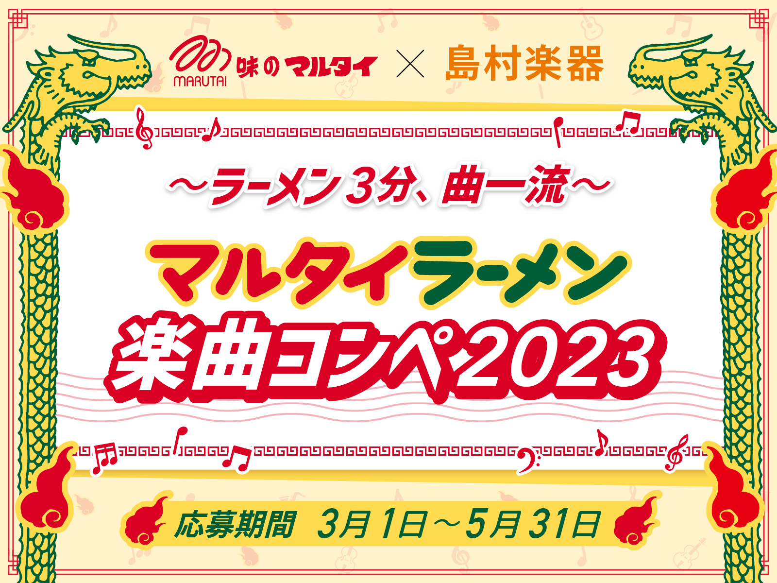 島村楽器株式会社(本社:東京都江戸川区、代表取締役社長:廣瀬 利明、以下 島村楽器)は、長年広く家庭で親しまれている「棒ラーメン」でおなじみの株式会社マルタイ(本社:福岡県福岡市、代表取締役社長:川島 英広、以下マルタイ)とコラボレーションし、『マルタイラーメン』をイメージしたボーカル楽曲のコンペティション「~ラーメン3分、曲一流~ マルタイラーメン楽曲コンペ2023」を、2023年3月1日(水)より特設サイトにて募集開始いたします。