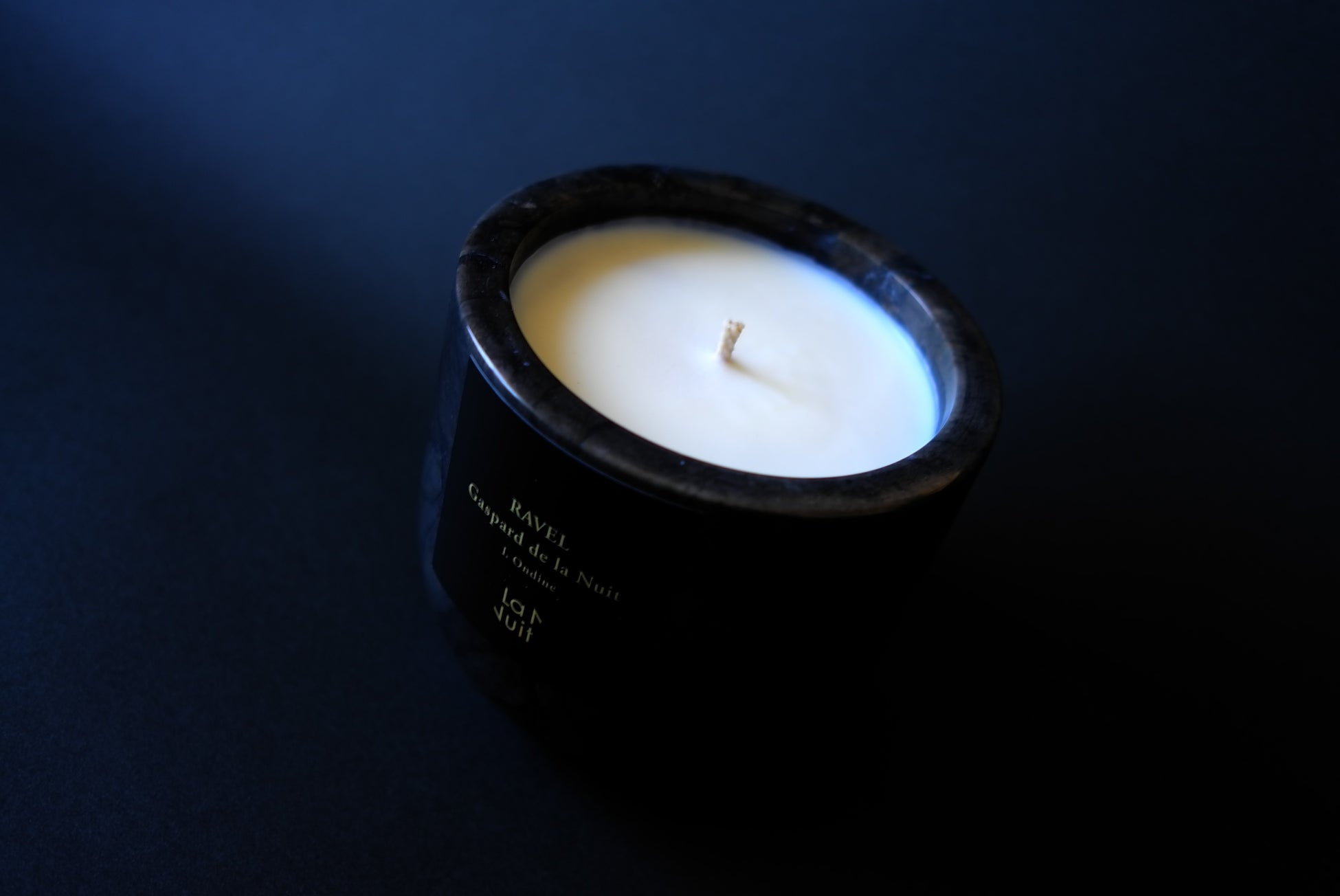 ストーンキャンドル「ラニュイ オンディーヌ」(400g、税込22000円)。器はラニュイのブランドカラー黒の大理石。燃焼終了後も物入れなどに使用可能。ストーンキャンドル「ラニュイ オンディーヌ」(400g、税込22000円)。器はラニュイのブランドカラー黒の大理石。燃焼終了後も物入れなどに使用可能。