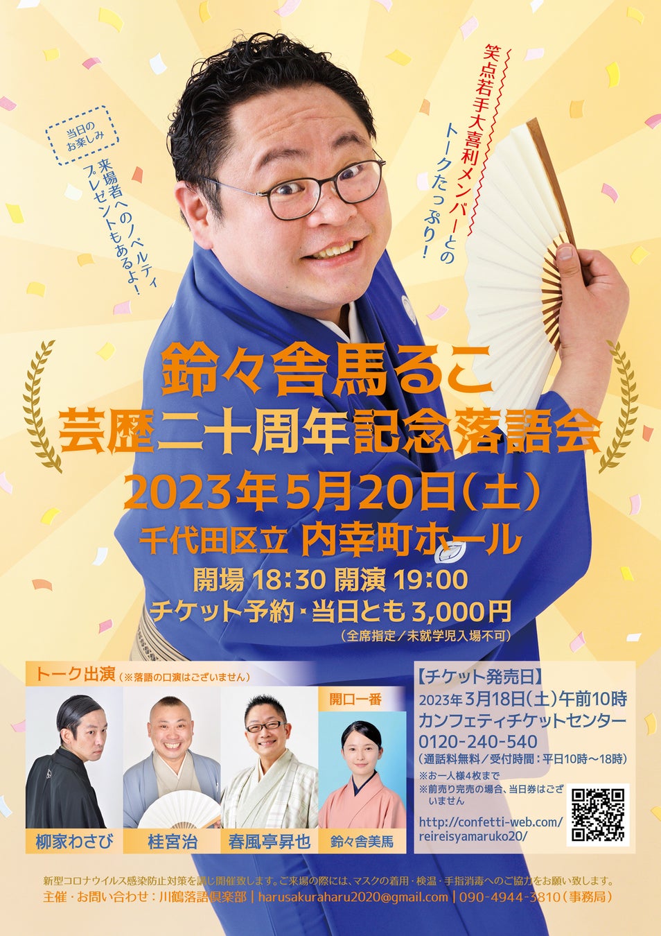 川鶴落語倶楽部主催、『鈴々舎馬るこ芸歴二十周年記念落語会』が2023年5月20日(土)に千代⽥区⽴内幸町ホール(東京都千代⽥区内幸町1丁⽬5-1)にて開催されます。