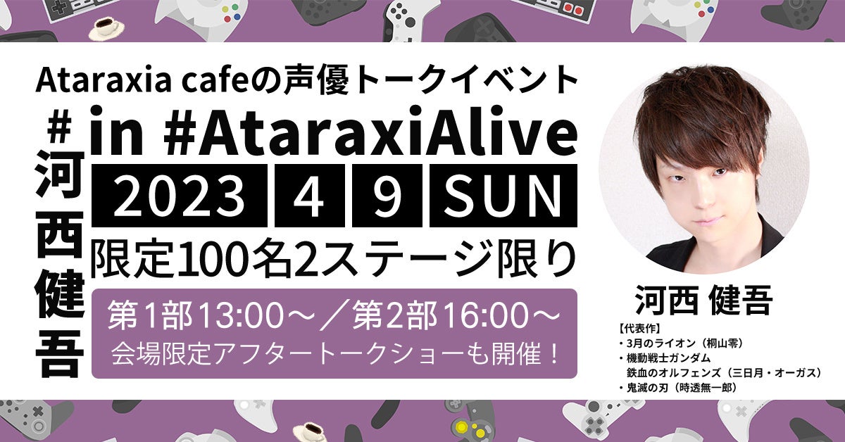 男性声優『河西健吾』さんが出身地である大阪の日本橋にあるオタク女子専用カフェサロンに来店致します。一般人&男子禁制のオタ女の為のカフェサロンがコンセプトの「Ataraxia cafe」(アタラキシアカフェ) が1日限りのスペシャルトークショーイベント『AtaraxiAlive』(アタラキシアライブ)を開催致します。