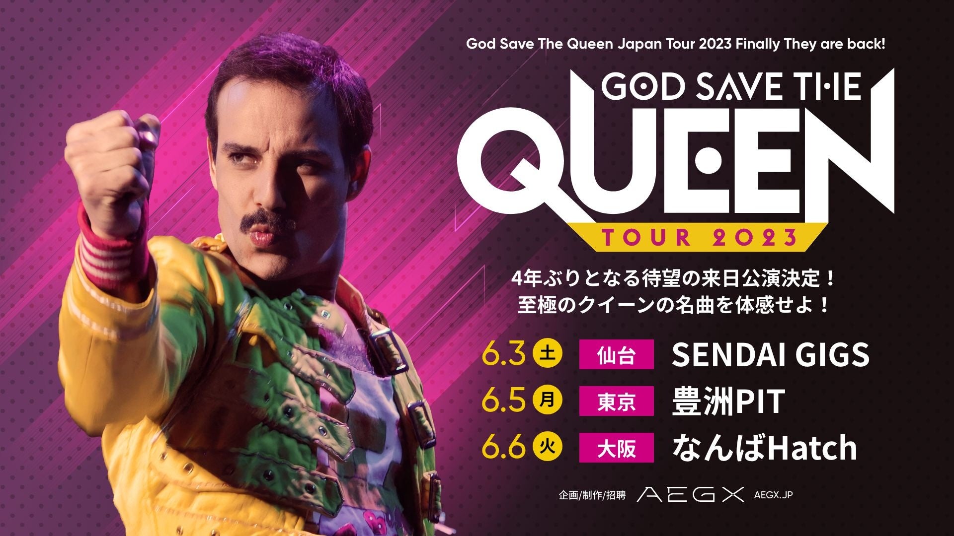 AEGXは、米ローリングストーン誌が「史上最高のトリビュートバンド」と絶賛する、英ロックバンド”QUEEN“のトリビュートバンド”God Save The Queen(ゴッド・セイヴ・ザ・クイーン)“の来日公演「God Save The Queen Japan Tour 2023 Finally They are back!」を、2023年6月3日(土)SENDAI GIGS、6月5日(月)豊洲PIT、6月6日(火)なんばHatch で開催することを発表しました。2017年9月の初来日以来、今回で4度目となります。
