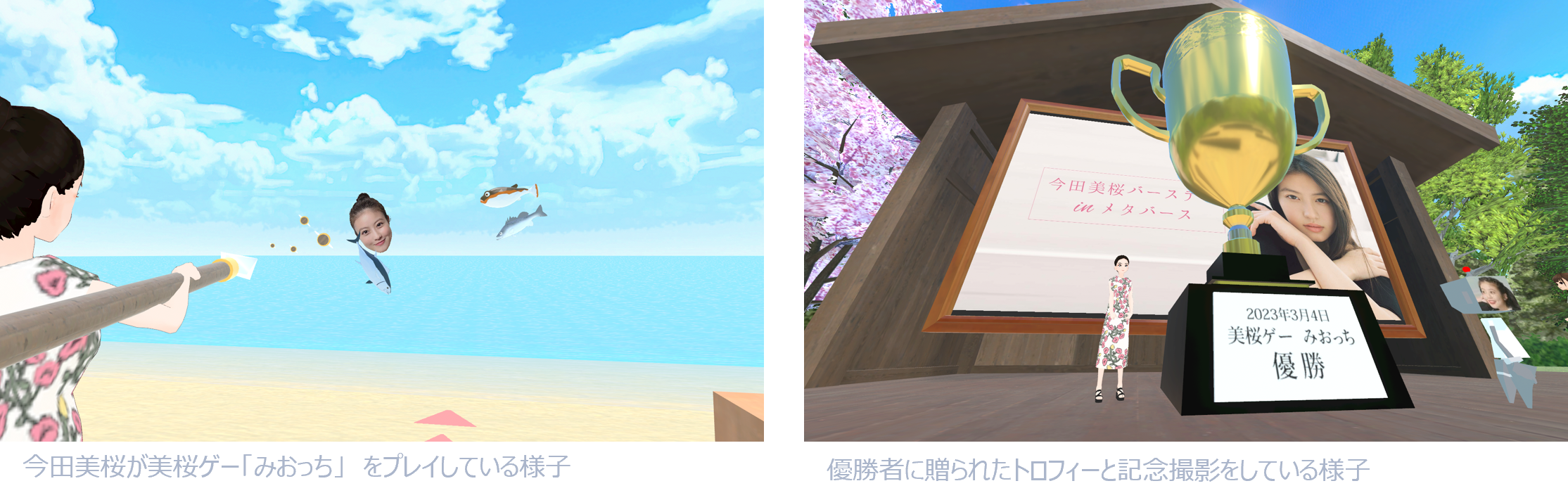 メタバース空間「今田美桜ワールド」では、今田美桜のミニゲームコーナーにて、魚をもりで射るゲーム「みおっち」をお楽しみいただけます。今回のイベントでは、今田美桜ワールドがオープンして以来の中でイベント参加者の中で最高得点を獲得した優勝者に、記念トロフィーと、今田美桜アバターとの2ショット撮影の権利が授与されました。今田からは、「優勝おめでとうございます!これからも高得点を目指して頑張ってください!!」と、お祝いコメントを送りました。