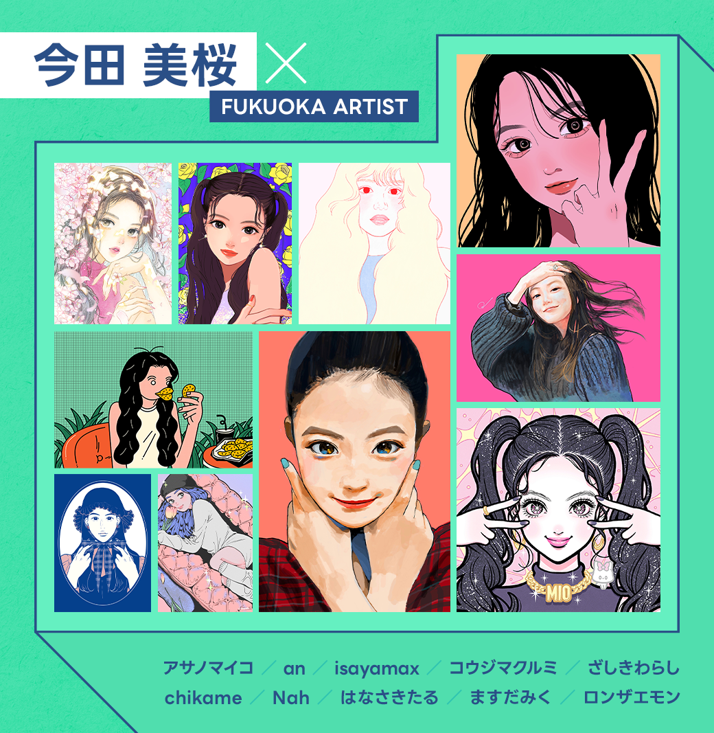 メタバース空間今田美桜ワールドのカフェ空間にも展示されている、今田美桜さんの出身地である福岡県に関係する10人のアーティストが描いたオリジナルイラストを、LINE NFTで販売しています。