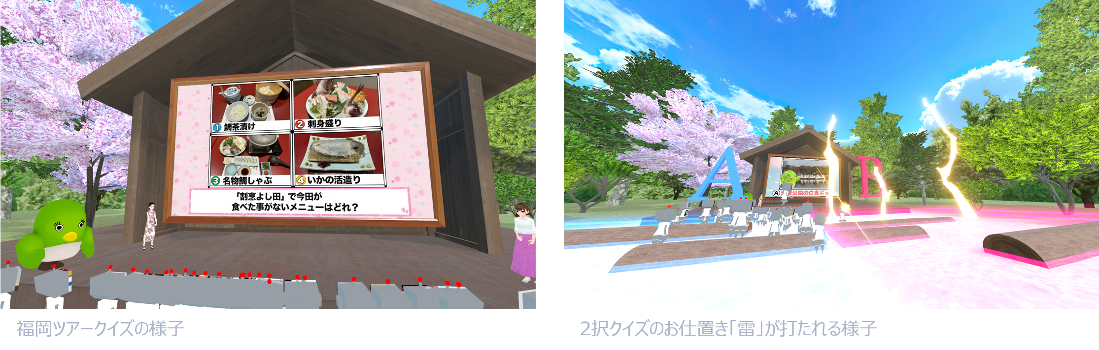 クイズ大会が進む中、エリア内にはA、Bとかかれた大きな看板が出現。参加者が看板の前にアバターを移動させて回答する、メタバースらしさのある2択クイズが始まりました。間違った方には、今田美桜によるお仕置きの雷が打たれるという仕組みになっています。今田美桜ファースト写真集の撮影にまつわる内容のクイズでは、間違った回答者に対して強烈な雷をあてた今田美桜に、MCも「すごい雷!」と驚嘆。「知ってる方も多いと思うので、正解してほしかったんです!(笑)」と、ツンデレなコメントに、ファンの皆さんのやる気も高まりました。