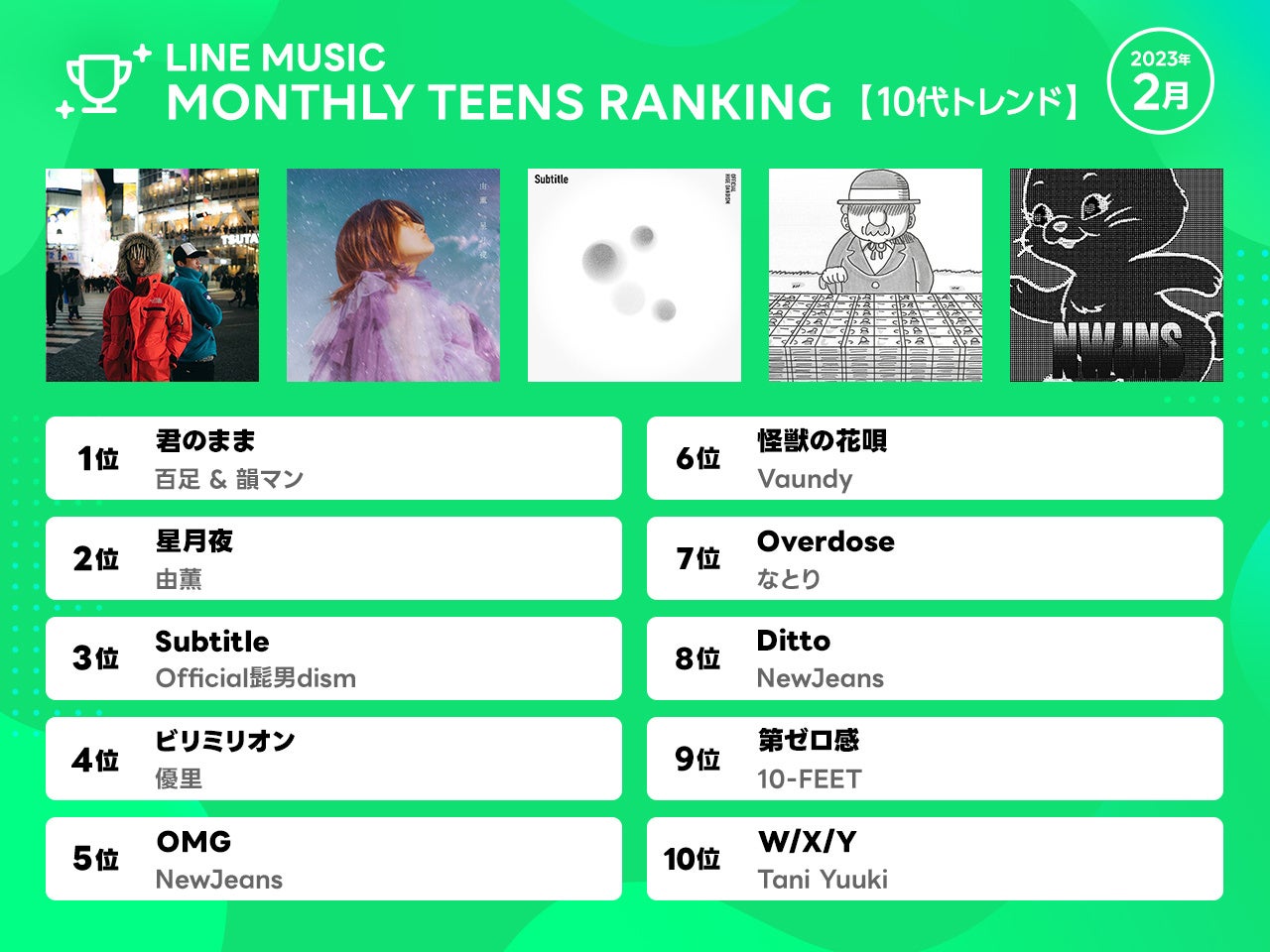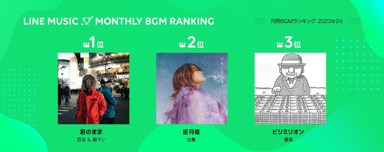 LINE MUSIC株式会社は、当社が運営する音楽ストリーミングサービス「LINE MUSIC」( https://music.line.me/ )の2月の月間ランキングを発表、人気楽曲100曲を集めたプレイリストを公開します。さらに、「LINE MUSIC」独自のロジックで10代が今最も注目している楽曲を10代トレンドランキングとして発表いたします。