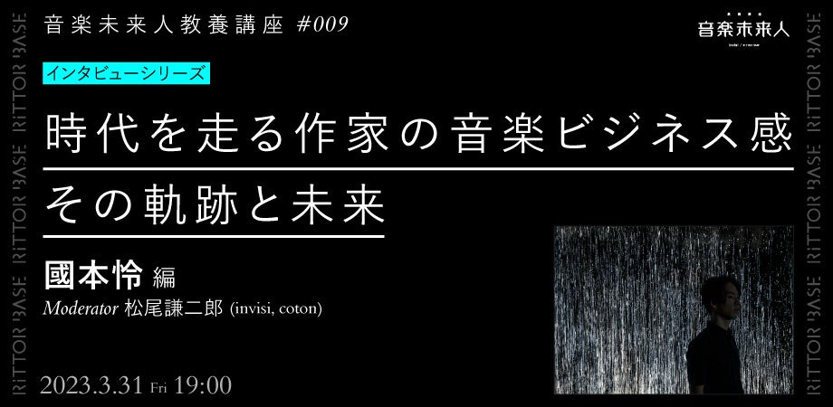 株式会社インビジ(代表:松尾謙二郎、以下インビジ)と、多目的スペース「御茶ノ水RITTOR BASE(リットーベース)」(運営:株式会社リットーミュージック)は、音楽ビジネスの未来を多彩なゲストとともに考える連続イベント 「音楽未来人教養講座」第9回を國本怜氏をゲストに迎え3月31日(金) に開催します。https://miraijin-09.peatix.com/