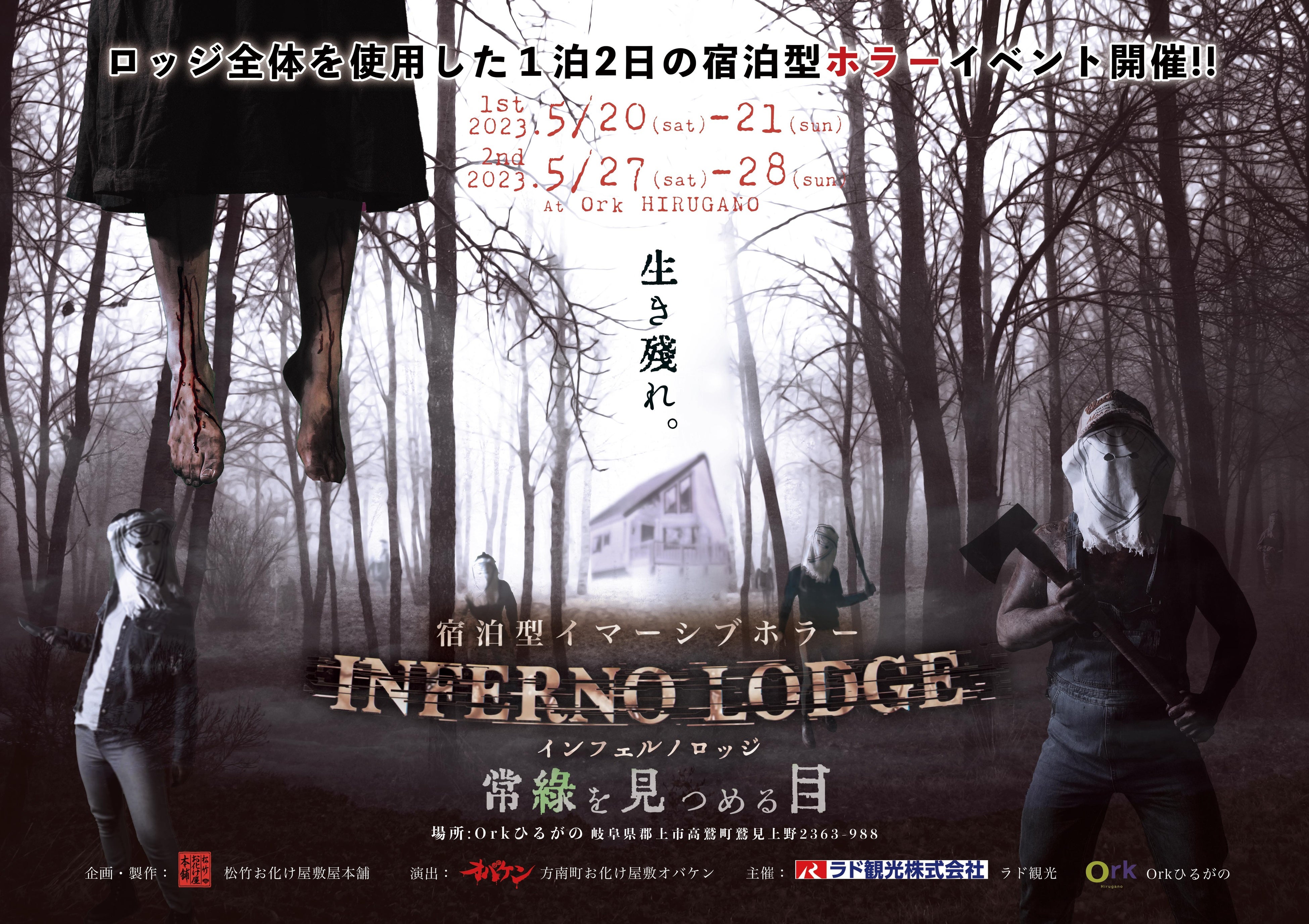 松竹株式会社が手掛けるお化け屋敷ブランド「松竹お化け屋本舗」は、2023.5/20(土)〜21(日)・5/27(土)〜28(日)、岐阜県郡上市の貸し別荘施設「Orkひるがの(オークひるがの)」にて、宿泊型イマーシブホラーイベント『INFERNO LODGE(インフェルノロッジ)~常緑を見つめる目~』を開催致します。