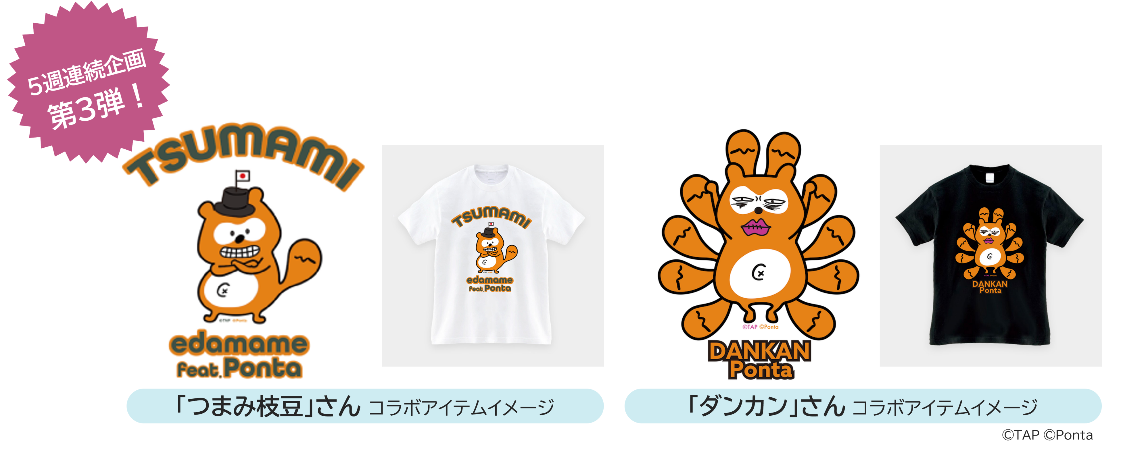Ponta Gearでは、5週連続企画として、新たなクリエイターやキャラクターなどとコラボしたポンタデザインを発表しています。このたびの第3弾では、たけし軍団のお二人がデザインを担当し、自由な発想で生み出されたコラボならではのポンタが登場します。「つまみ枝豆」さんには、ご自身のトレードマークのハットを着用したポンタを描いていただきました。また、「ダンカン」さんによるポンタは、10本のしっぽに隈のある目元、厚めの唇をしたデザインです。Tシャツやトートバッグ、マグカップなどのアイテムを販売します。