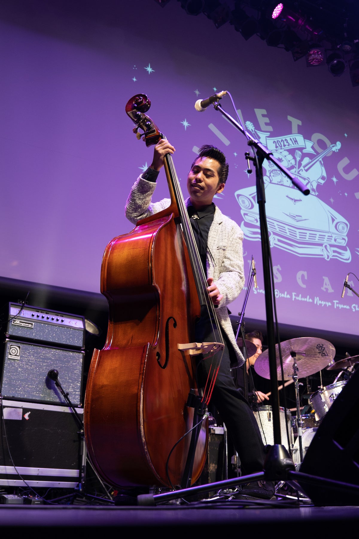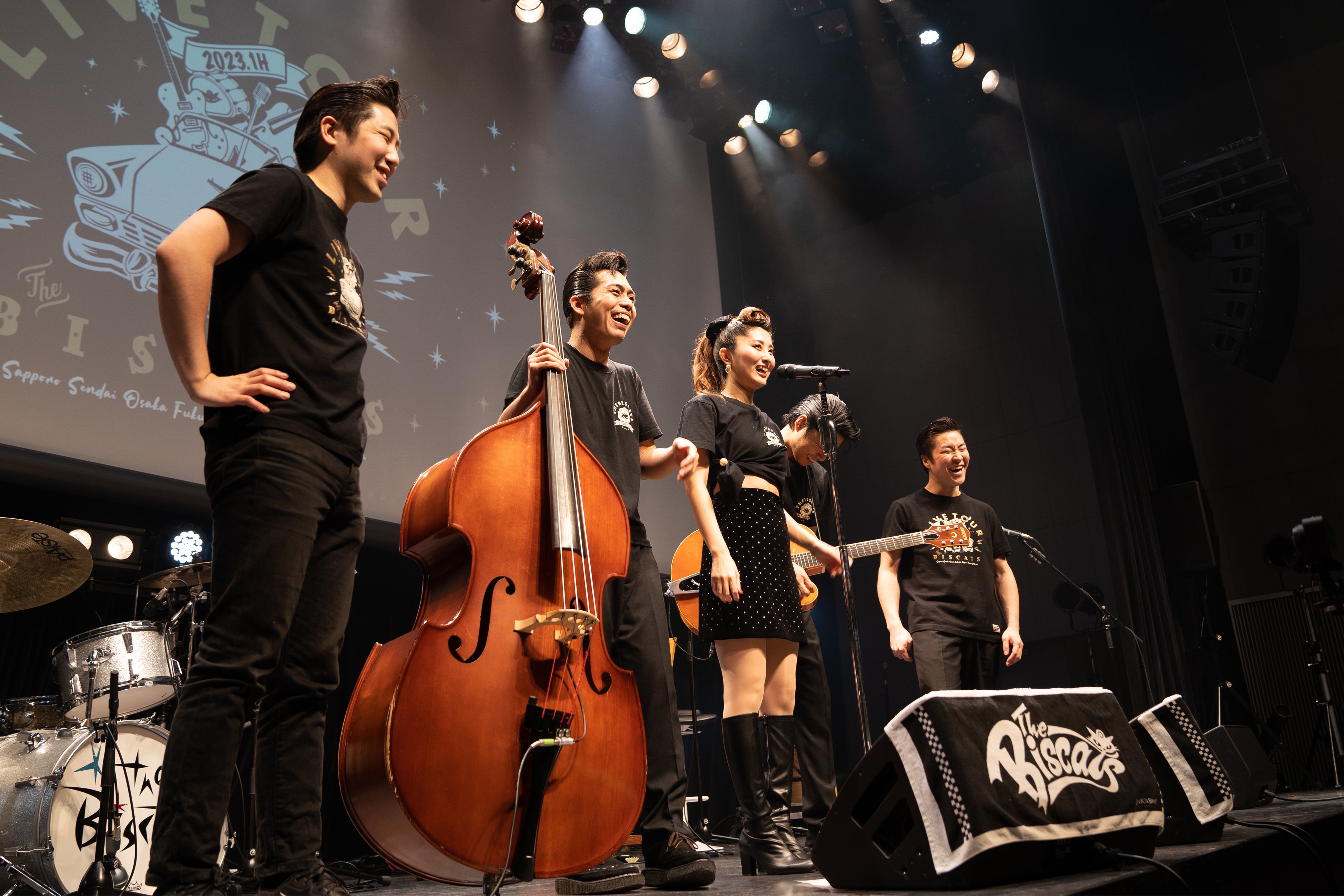 続いて、The BiscatsによるGRP(ガンバロカビリープロジェクト)の紹介が幕間VTRで上映されると、ロカビリーを若い世代に広めていくべく「01. 主催ライブは18歳以下無料とします」、アジア各国のロカビリーアーティストと「02. アジアロカビリー連盟を設立します」、そして当面の目標である「03 .2024年8月に渋谷公会堂(LINE CUBE SHIBUYA)に2000人集めます」──といった3本柱から成るプロジェクトへ応援の拍手を贈るオーディエンス。