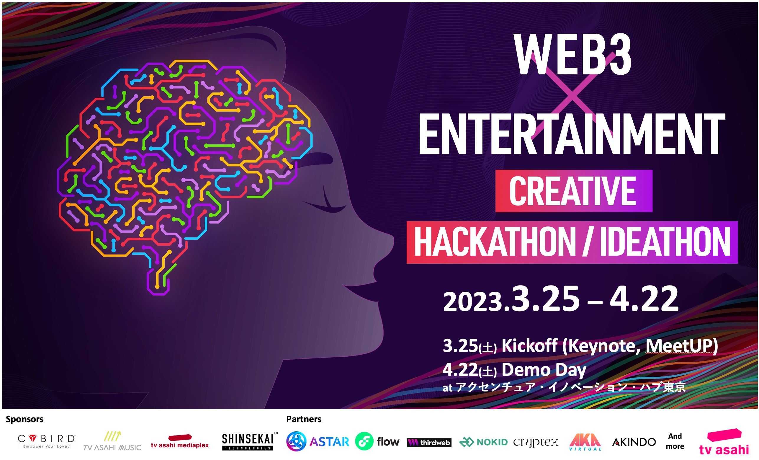 株式会社テレビ朝日(本社:東京都港区、代表取締役社長:篠塚 浩、以下 テレビ朝日)は、株式会社テレビ朝日メディアプレックスと国内最大規模700名が参加した「東京Web3ハッカソン」を運営したtreavry株式会社(代表取締役:金城辰一郎)と共に、「WEB3 x Entertainment Creative Hackthon/Ideathon」を開催することをお知らせします。2023年3月25日(土)KICK OFFイベントからエントリーを開始し、4月22日(土)DEMODAYでの受賞を目指して、エンジニアやクリエイターは誰でもエントリーが可能です。スポンサー各社(サイバード、テレビ朝日ミュージック、テレビ朝日メディアプレックス、SHINSEKAI Technologies等)やクリエイター参加支援パートナーNOKID、cryptex、AKA Virtual等と参加者との共創に取り組みます。KICK OFFイベントにNagi氏(MEGAMI Developer)、MetaKozo Dao等も登壇予定!