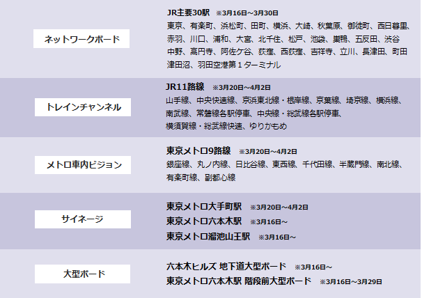 JR主要駅や東京メトロ六本木駅、大手町駅を中心に、30駅以上で交通広告を展開。その他、JR・東京メトロの車内ビジョン(トレインチャンネル等/計20路線)でもCM映像を放映いたします。