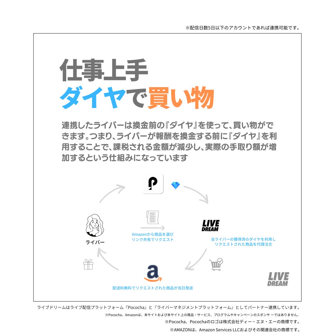 ライブ配信アプリPocochaにはライブ配信で獲得した収益を、実際の通貨と同様に換金できる『ダイヤ』というデジタルコンテンツがあります。しかし、換金時には源泉徴収税が発生してしまい、ライバーの皆様にとっては大きな損失につながることもあります。そこで、ライブドリームが提供する『ダイヤで買い物』を利用すればこの問題を克服できます。『ダイヤで買い物』とは、Amazonで商品を購入する際に『ダイヤ』を利用して支払いを行い、合計獲得ダイヤから『ダイヤ』の利用分を差し引いた金額が、配信者の報酬として支払われるというサービスです。つまり、『ダイヤ』を自由に換金できないという弱みを克服することができながら、課税される金額が減少し、実際の獲得報酬額が増加するという仕組みになっています。このサービスを利用すれば、配信者の皆様は自身の報酬をより有効活用できるとともに、視聴者にとってもより魅力的なライブ配信が提供できます。ぜひこの機会に、ライブドリームの『ダイヤで買い物』を活用して、より効率的に報酬を得ることができるようになりましょう。