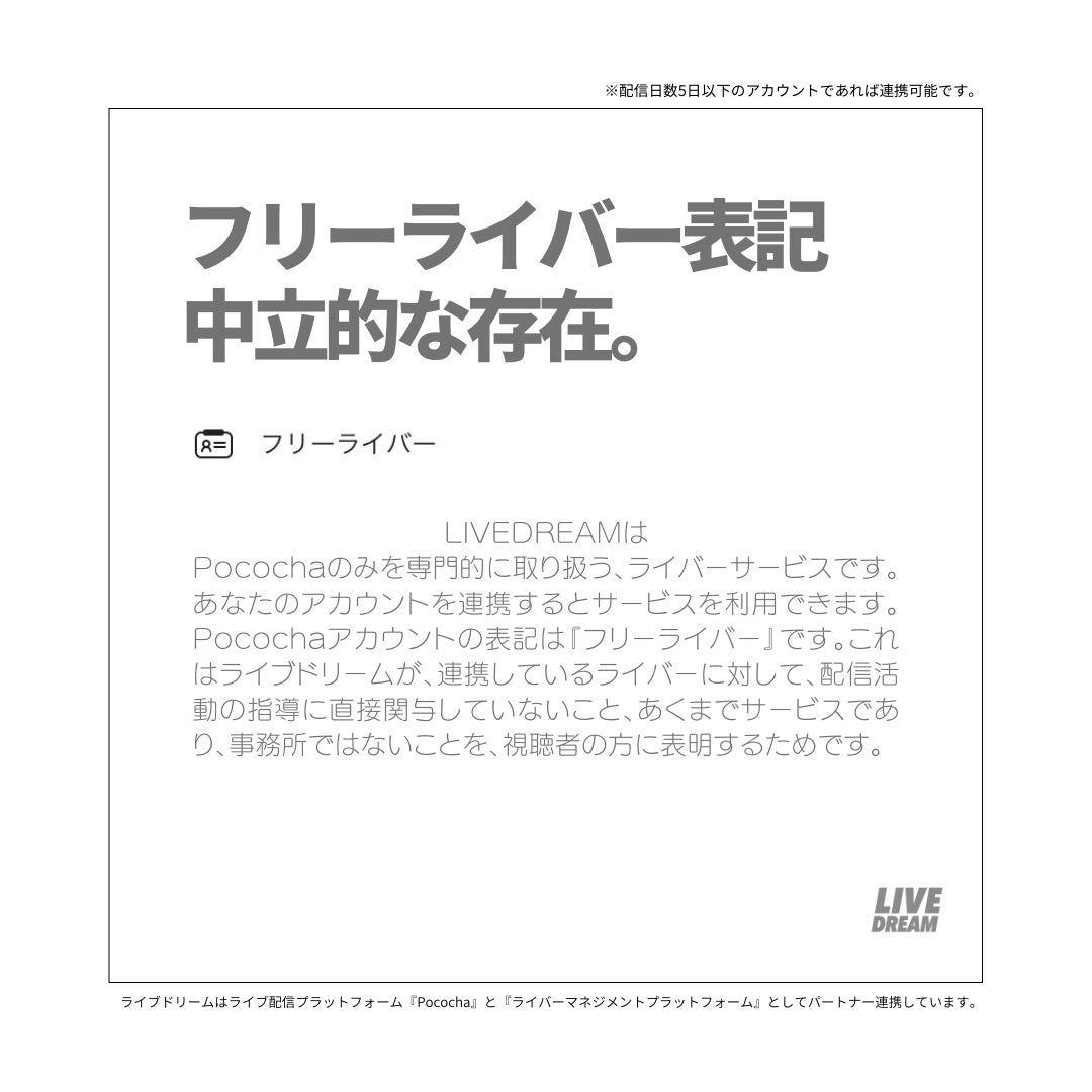アカウントを連携するとライブドリームのサービスを利用できます。ですが、連携したライバーのPocochaアカウントの表記は『フリーライバー』です。これはライブドリームが連携しているライバーに対して、配信活動においての指導に直接関与(口出し)していないこと、あくまでサービスであり事務所ではないことを、視聴者の方に表明するためとなっています。また、HPにはリスナーへ向けたメッセージページも用意されており、あくまで「フリーライバーがサービスを利用しながら活動している」とし、一般的には「所属」と表現される場面でも「連携」と表現したり、他とは違う演出力も魅力の一つです。