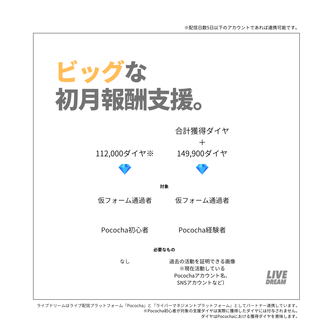 Pococha専門事務所LIVEDREAM『ライブドリーム』の新サービス、【ダイヤで購入】【初月報酬支援】【フリーライバー表記】をお知らせします。