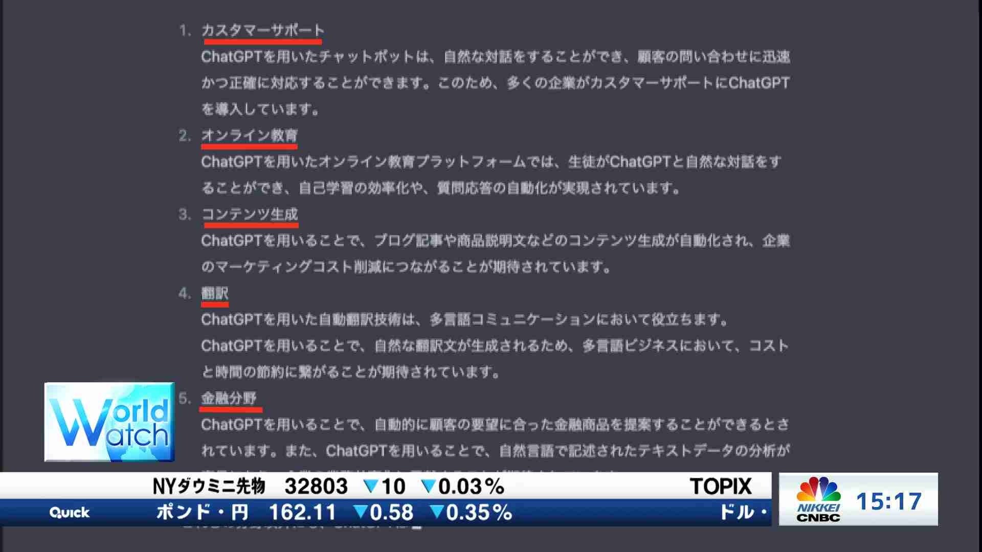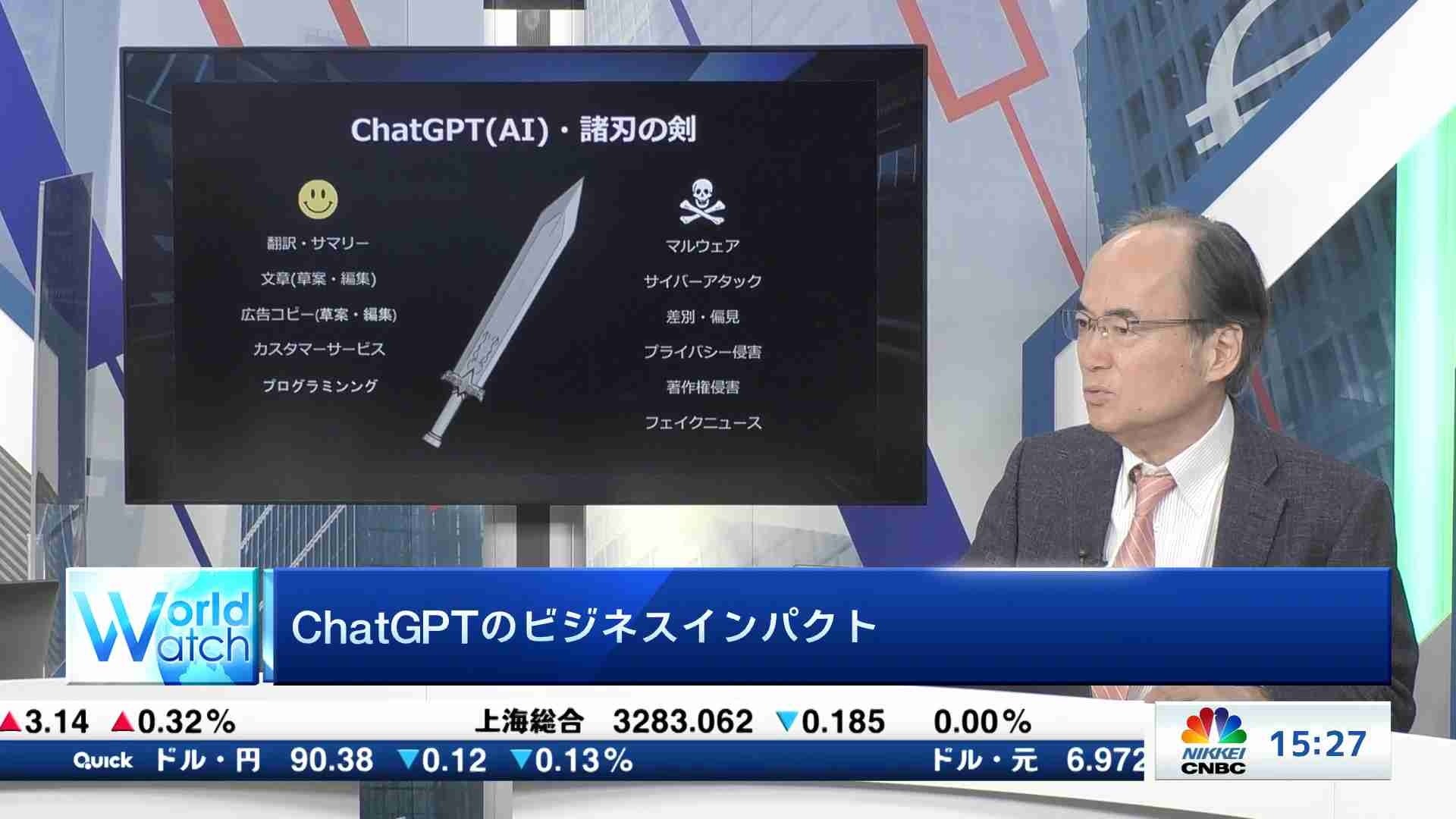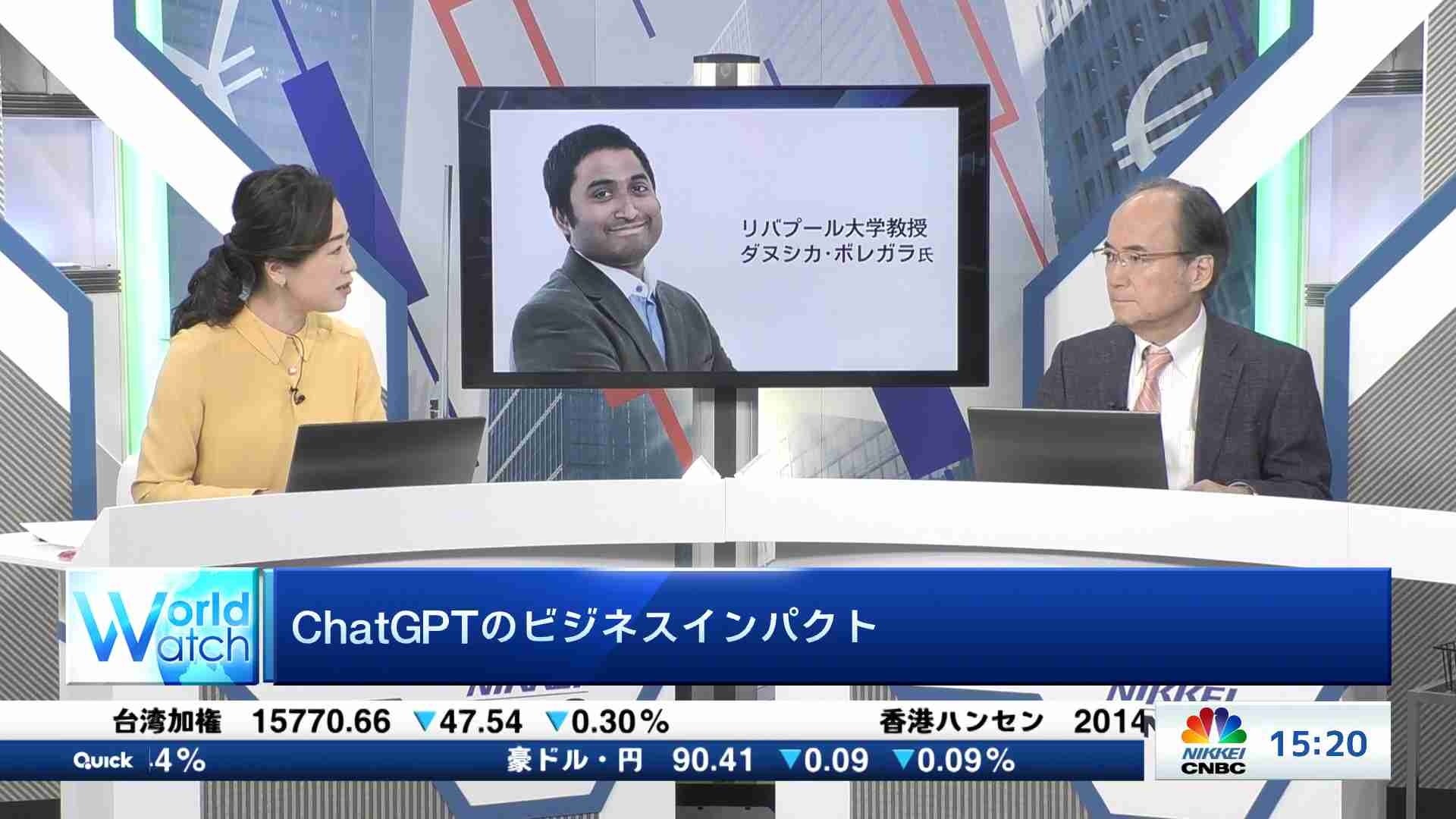 株式会社日経CNBC(本社:東京都千代田区、代表取締役社長:竹之内源市、以下「日経CNBC」)は、2023年3月9日(木)に放送した特別企画「World Watch『ChatGPTのビジネスインパクト』」のアーカイブ(VOD)動画の無料公開を開始しました。