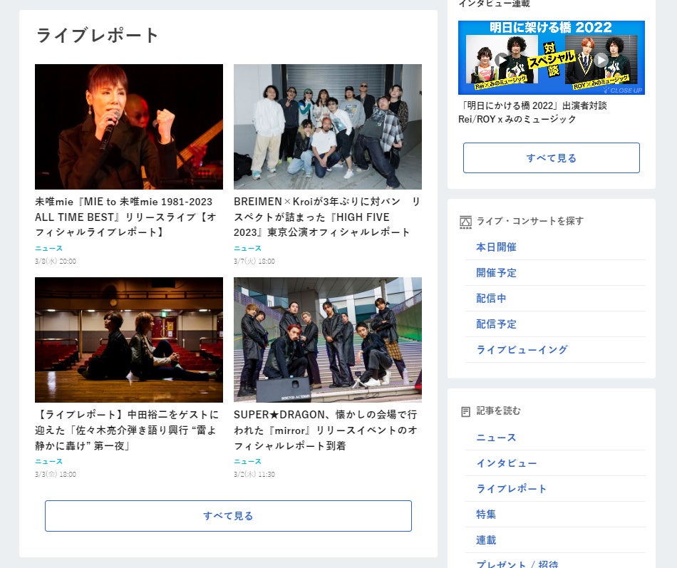 アーティストのインタビューやライブレポート、オリジナル連載等、ここでしか読めないコンテンツに加え、「注目の公演」「本日開催の音楽ライブ・コンサート」等、最新の音楽チケット情報や公演開催情報もお届け。公演情報の検索機能については今春、機能拡充第2弾のアップデートを予定しています。
