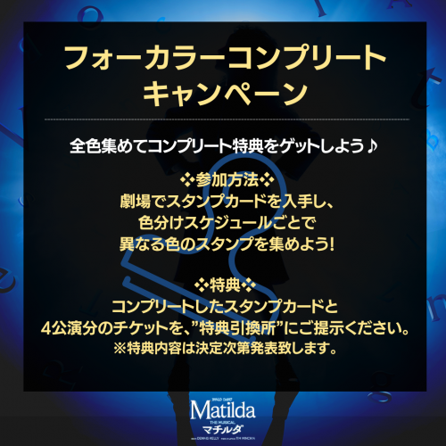 コンプリートしたスタンプカードと4公演分のチケットを、”特典引換所”にご提示ください。特典内容は決定次第発表致します。