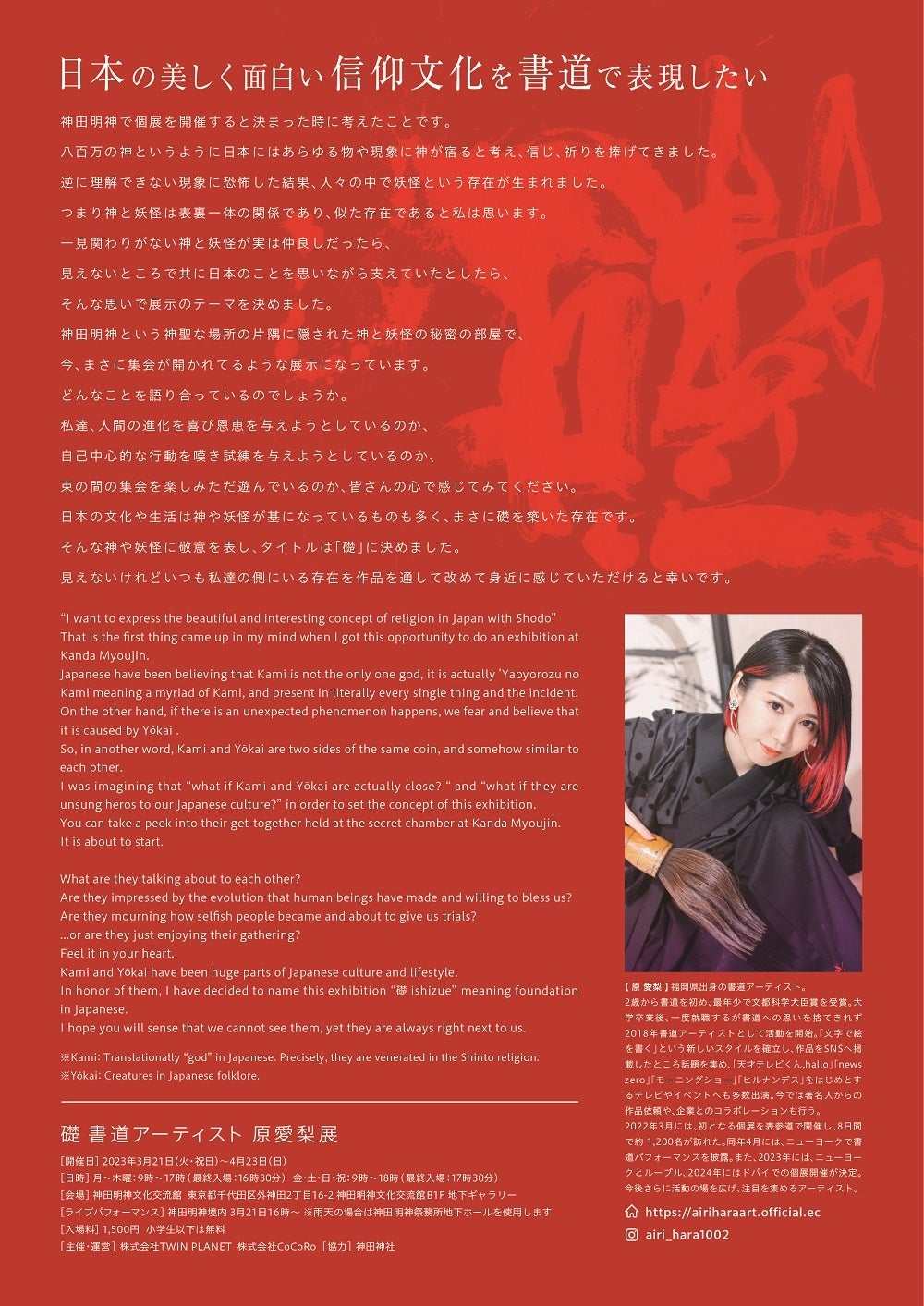 株式会社ツインプラネット(代表取締役:矢嶋健二/東京都渋谷区)所属の書道アーティスト・原愛梨(はらあいり)が、2023年3月21日(火・祝)から4月23日(日)まで神田明神文化交流館 地下ギャラリー(東京都千代田区)にて個展を開催いたします。