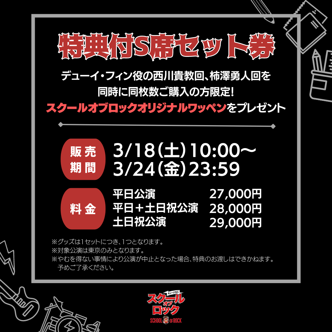 デューイ・フィン役の西川貴教回、柿澤勇人回を同時に同枚数ご購入の方限定でスクールオブロックオリジナルワッペンをプレゼントいたします。