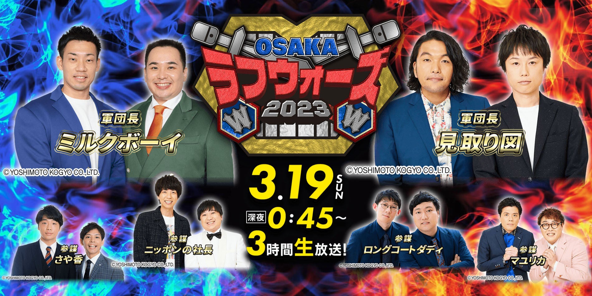 『OSAKAラフウォーズ2023』が今年も放送決定!ミルクボーイ軍vs⾒取り図軍による総勢14組の若⼿芸⼈が賞⾦100万円をかけて熱き戦いを繰り広げる。勝敗を決めるのはTwitterでの視聴者投票!各軍には、人気・実力ともにうなぎ登りのロングコートダディ&ニッポンの社長&マユリカ&さや香が参謀として登場し、軍団長をサポート。勝つのはミルクボーイ軍か、それとも⾒取り図軍か…⁉