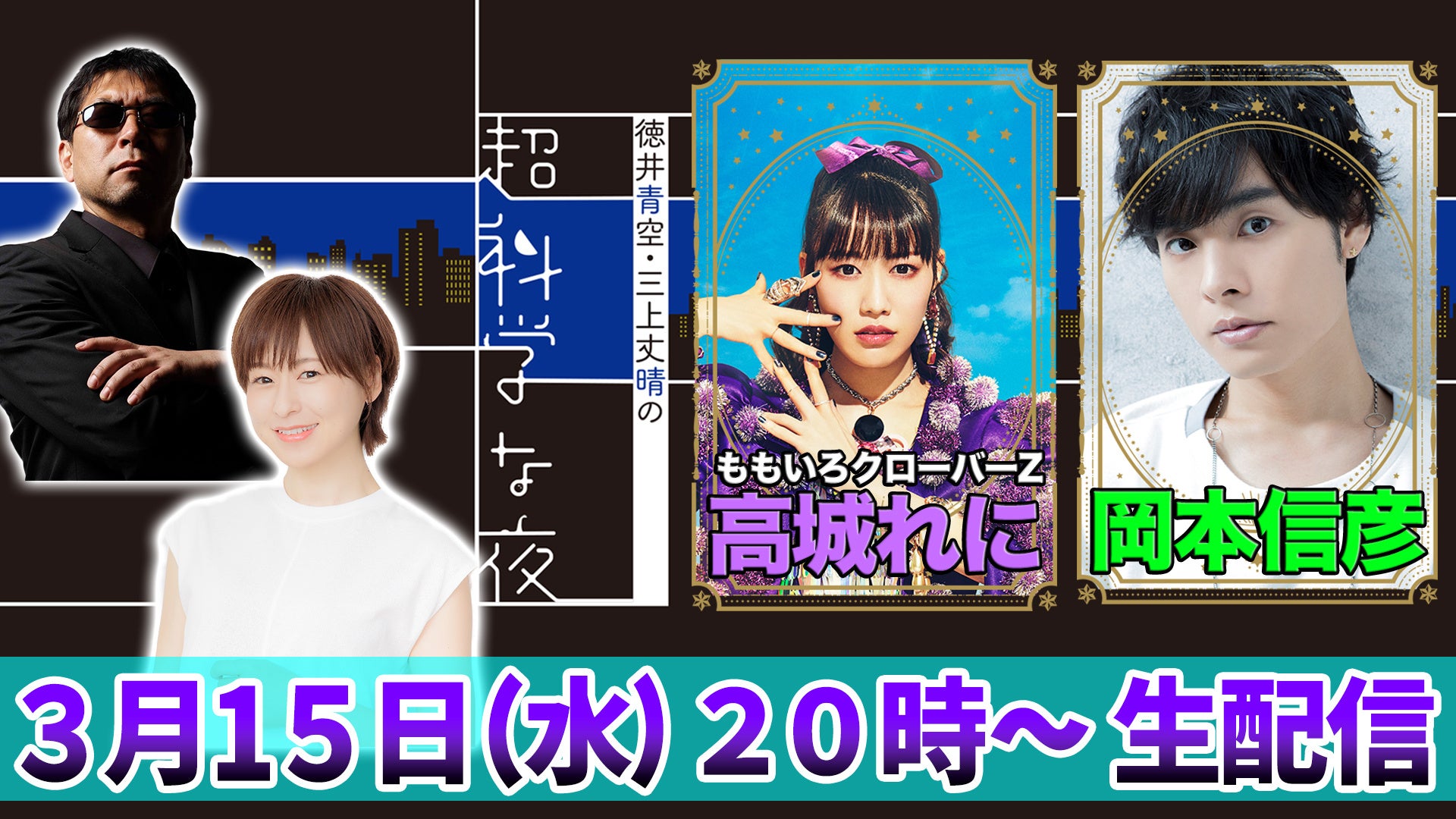 株式会社ドワンゴは、同社が運営する「ニコニコチャンネルプラス」(https://portal.nicochannel.jp/)のチャンネル「徳井青空・三上丈晴の超科学な夜」2023年3月15日(水)20時からの第3回目生放送に、ももいろクローバーZの高城れにと声優の岡本信彦がゲスト出演することをお知らせします。