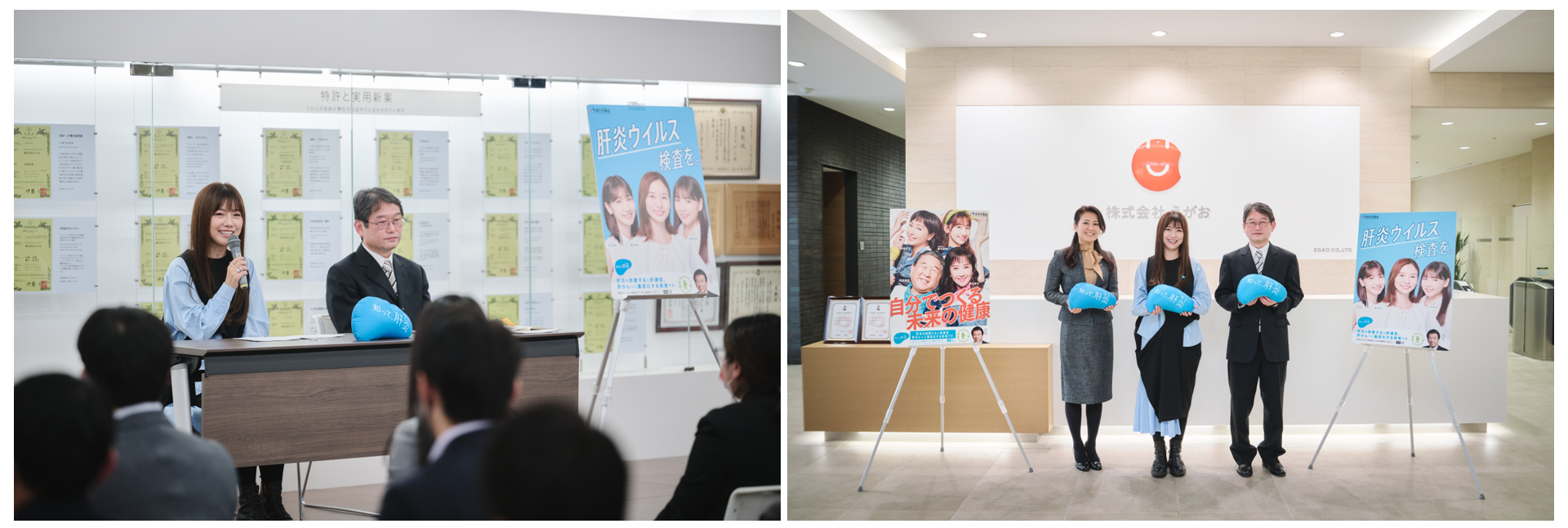 株式会社えがおへの訪問では、株式会社えがお 常務取締役 兼 健康経営推進委員会アンバサダーの北野 晶氏とも面会し、肝炎対策をテーマに対談を行いました。