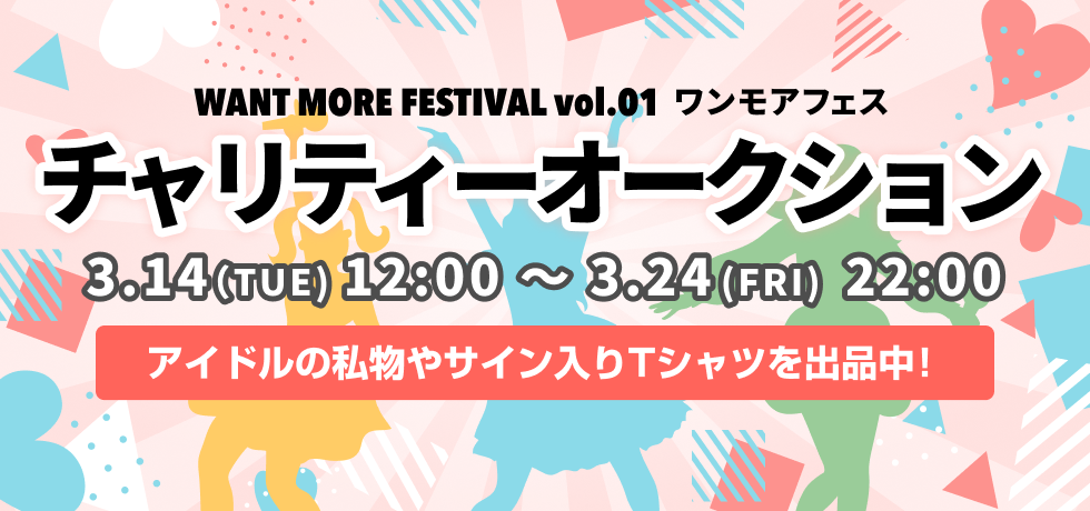 たくさんの応援に支えられたからこそ“自らも社会に還元できるイベントを行いたい”というアイドルグループ等が集い、「ワンモアフェスチャリティーオークション」の開催に至りました。