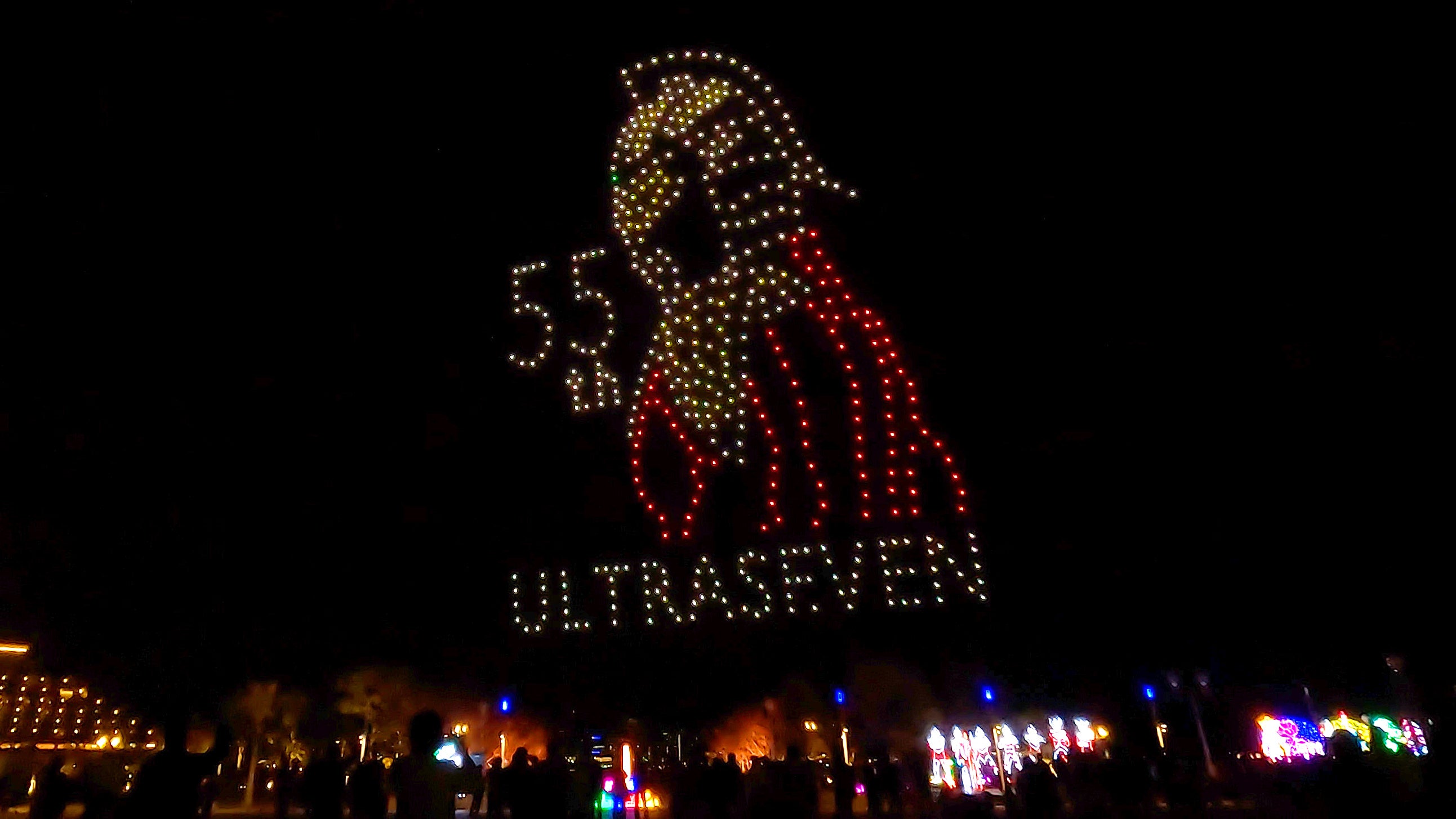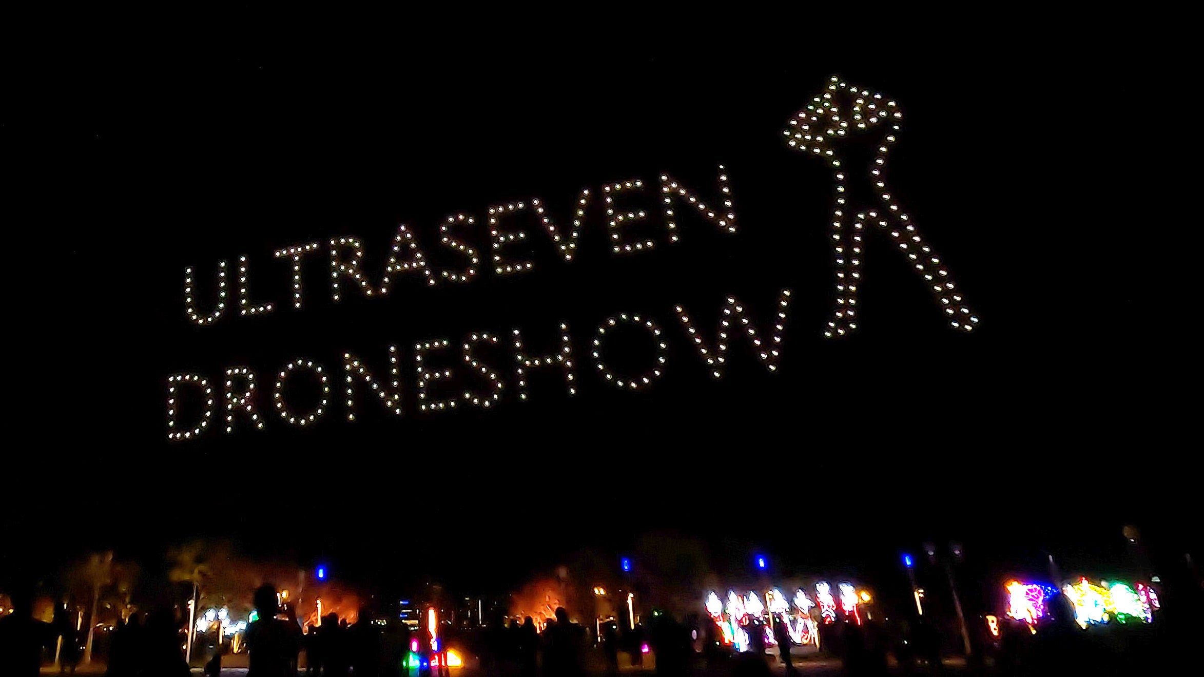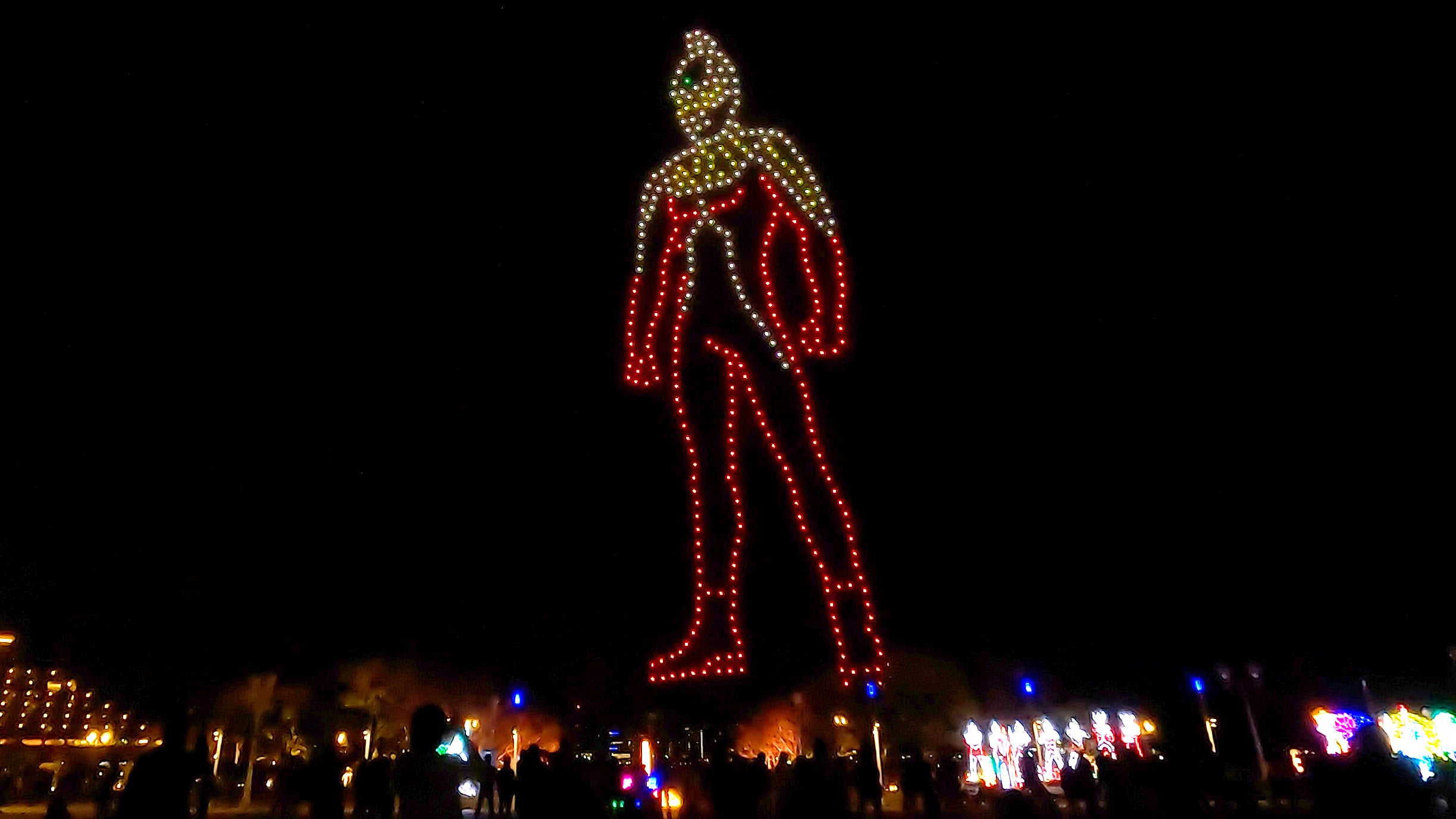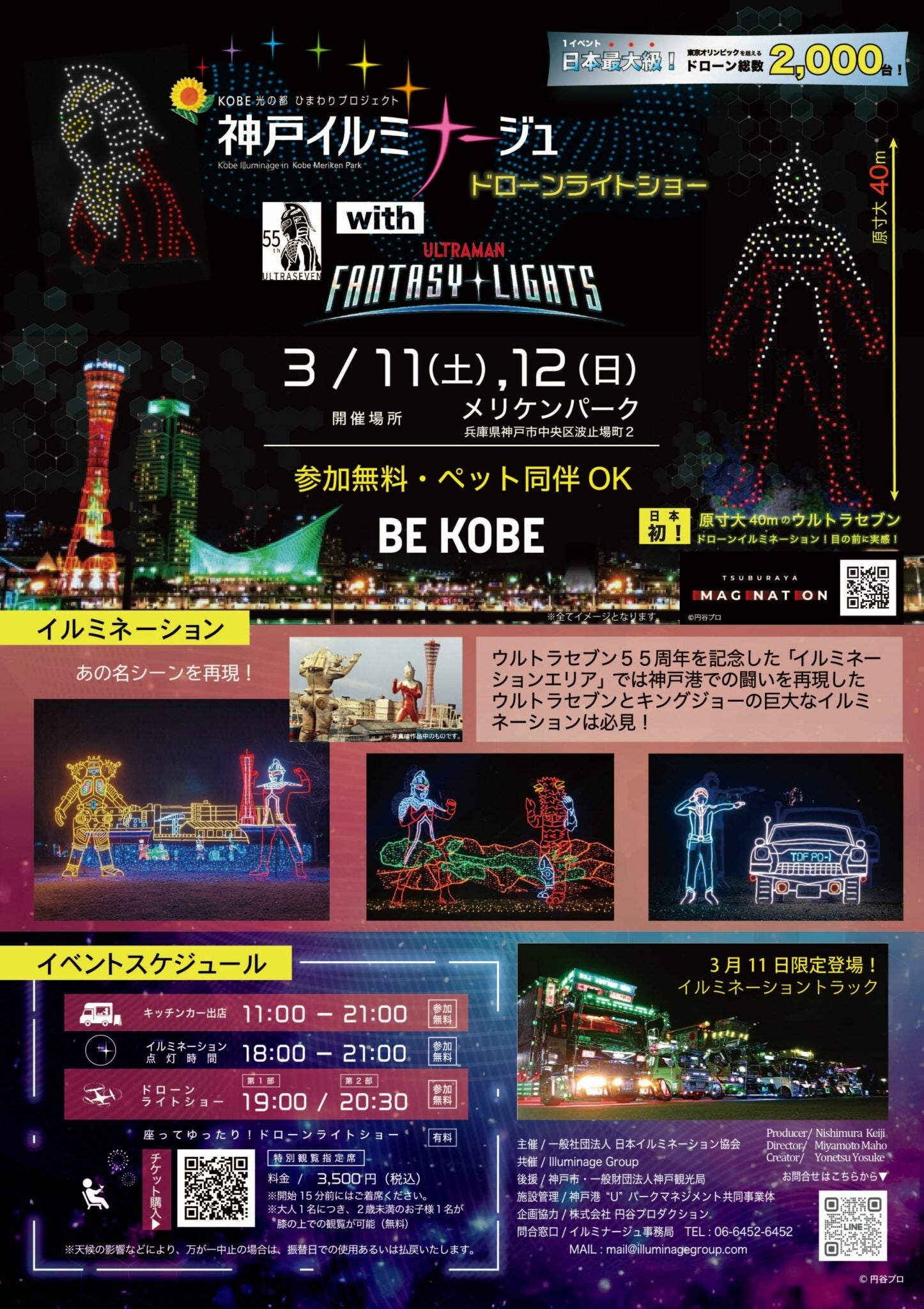 株式会社ドローンショーは、3月11、12日にウルトラセブン55周年を記念して神戸市メリケンパークで開催した「神戸イルミナージュ ドローンライトショー」にて演出家の潤間大仁氏と共にドローンショー演出を担当しました。