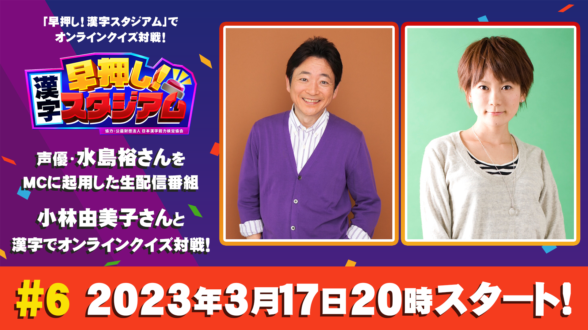 イマジニア株式会社(東京都新宿区、代表取締役社長 兼 CEO 澄岡和憲、以下「当社」)は、配信中のNintendo Switch™ダウンロード専用ソフト「早押し!漢字スタジアム」(以下「本作」)につきまして、声優の水島裕さんをMCに起用した生配信番組を配信中ですが、3月17日(金)に第六回の配信を行いますので、お知らせします。