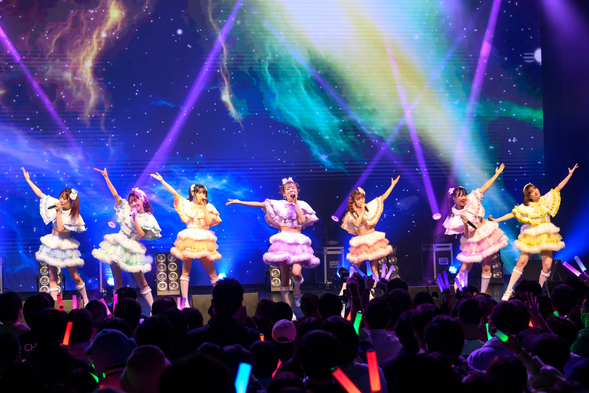 木村ミサの掛け声で最初にステージに上がったのはIDOLATER。ファッショナブルな水色の衣装で登場した彼女たちは『消せない・・・』のクールなパフォーマンスで、いきなりファンの心を鷲掴みにする。さらに、『Endless Summer』、『Vapor City』、『キミに夢CHU♡XX』、『まほうのカギを手に入れたら』と立て続けにジャンルの異なる楽曲を披露し、ポテンシャルの高さを観客に見せつけた。