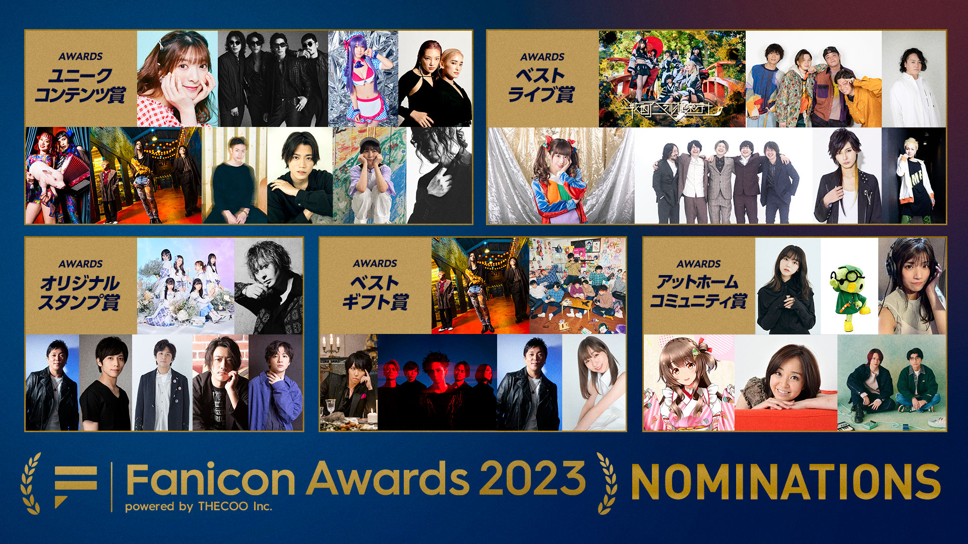 THECOO株式会社(読み:ザクー、本社:東京都渋谷区、代表取締役CEO:平良真人、証券コード:4255、以下「当社」)は、3月23日(木)19時30分より開催する「Fanicon Awards 2023」で表彰する11賞(各賞10賞+MVC賞***)のうち、5賞の受賞コミュニティを決定しましたのでお知らせいたします。「Fanicon Awards 2023」では受賞したコミュニティの中から、最も優秀なコミュニティを各賞1コミュニティずつ選定し、大賞として表彰します。大賞を獲得した計10コミュニティ+MVC賞の表彰の様子を3月23日YouTube生配信でお届けします。