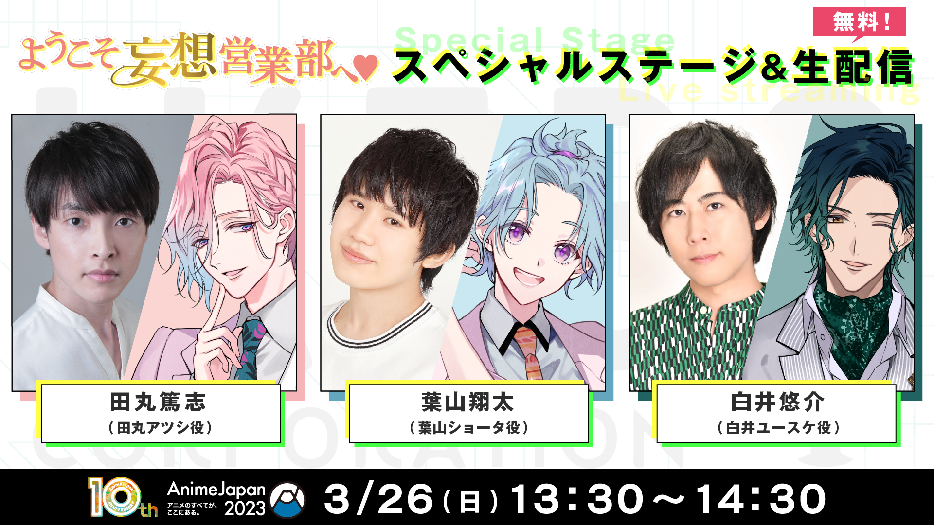 7月2日(日)に最新イベントの開催が発表された人気男性声優が出演する即興ドラマバラエティ「ようこそ妄想営業部へ♥」から、これまでに登場した全キャラクターのNFTデジタルアート付きトレーディングカードを無料配布いたします。AnimeJapan2023の会場でしか手に入らない枚数限定トレカをぜひ入手してください。
